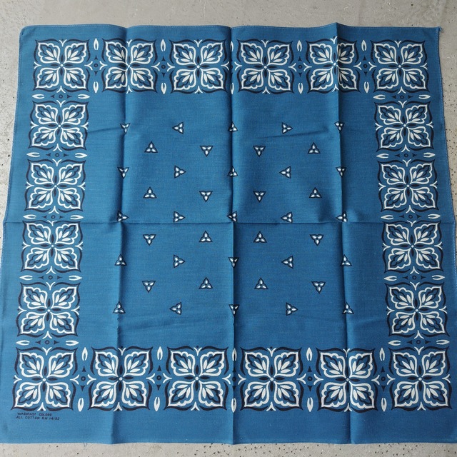 いいデザインです!! 70s ビンテージバンダナになります! レアカラーセルリアンブルーもビンテージならでは。 オススメになります! 55cm x 50.5cmになります。 洗いこんだ感、仕上げが雑なヶ所ございますが 雰囲気とレア度が間違いなく勝ってるかと思います! コンディション画像にてご確認くださいませ。 よろしくお願いいたします!! お取り扱い商品はユーズド商品になります。 細かいほつれやダメージなどございますが ビンテージ、古着ならではのよさとご了承の上 ご購入お願いいたします。 掲載商品の画像に関しまして ご覧になられておりますプラウザやパソコン等の環境により 実際のお色と異なる場合がございますので あらかじめご了承くださいませ。