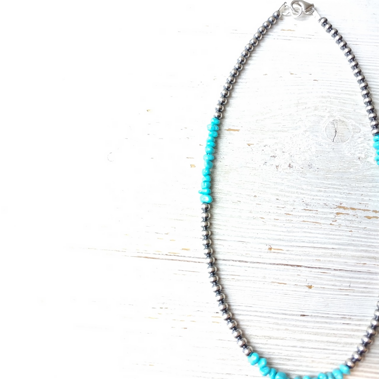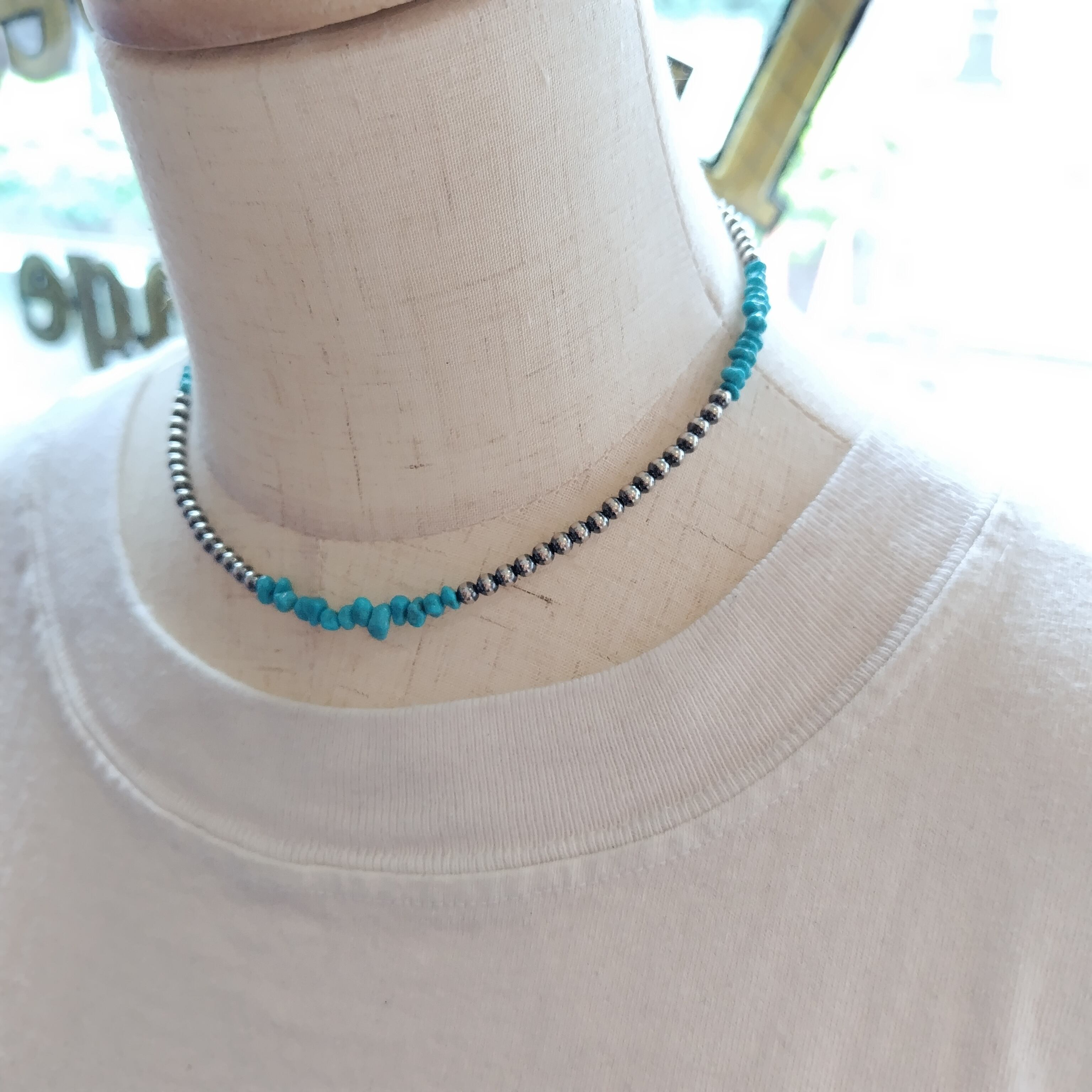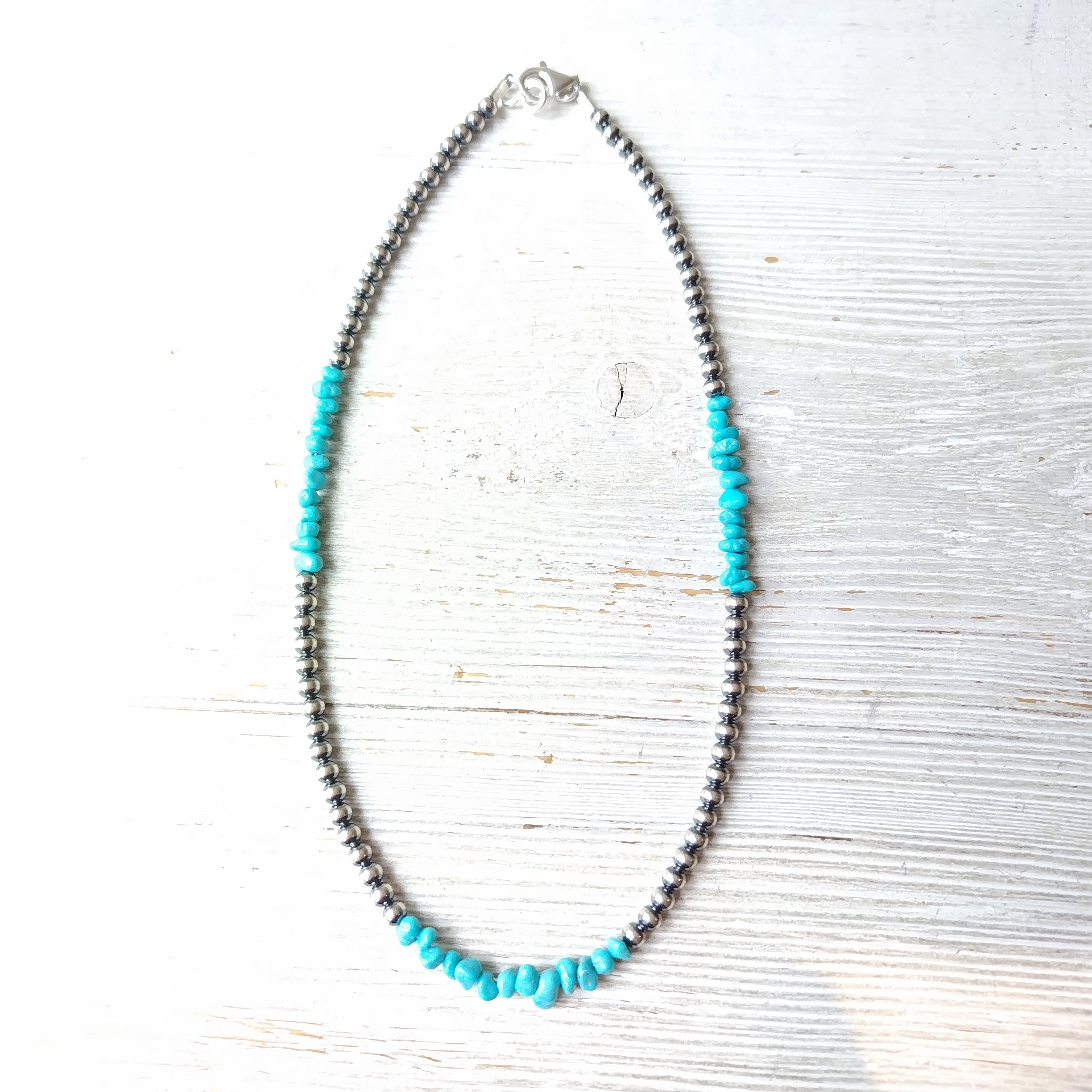雰囲気最高のターコイズ x ナバホパール 3mm玉 シャイニー x 燻 シルバーネックレスになります!