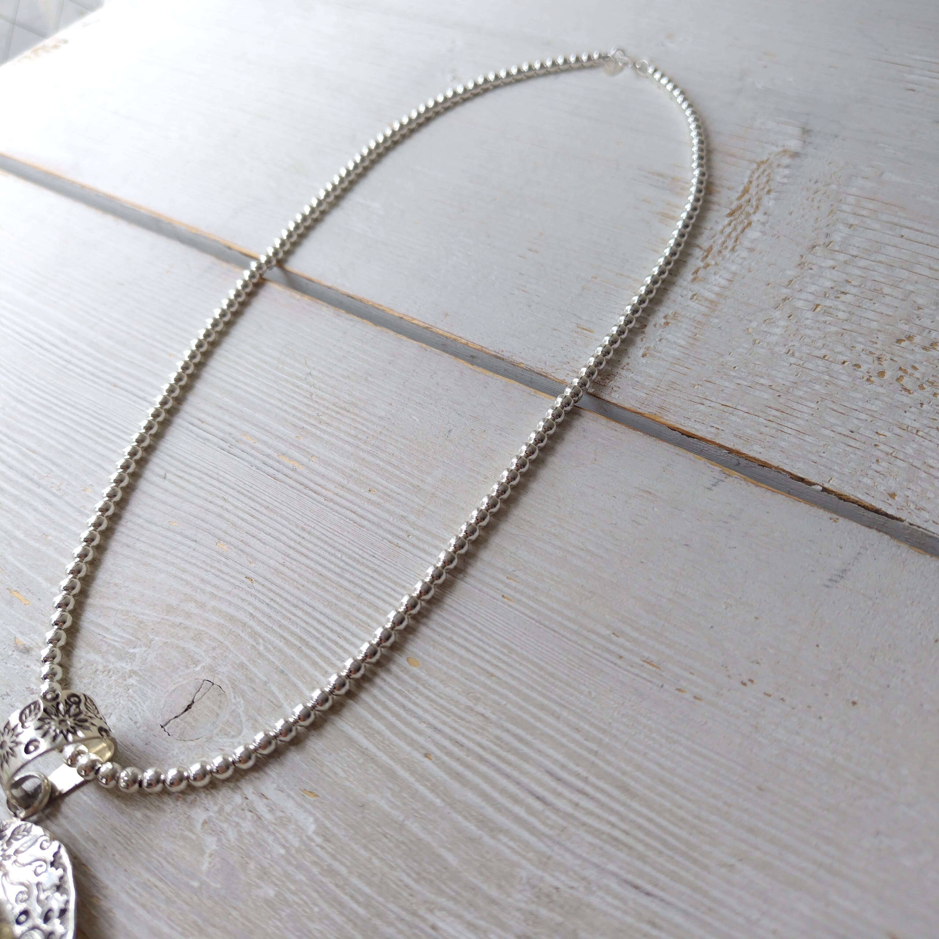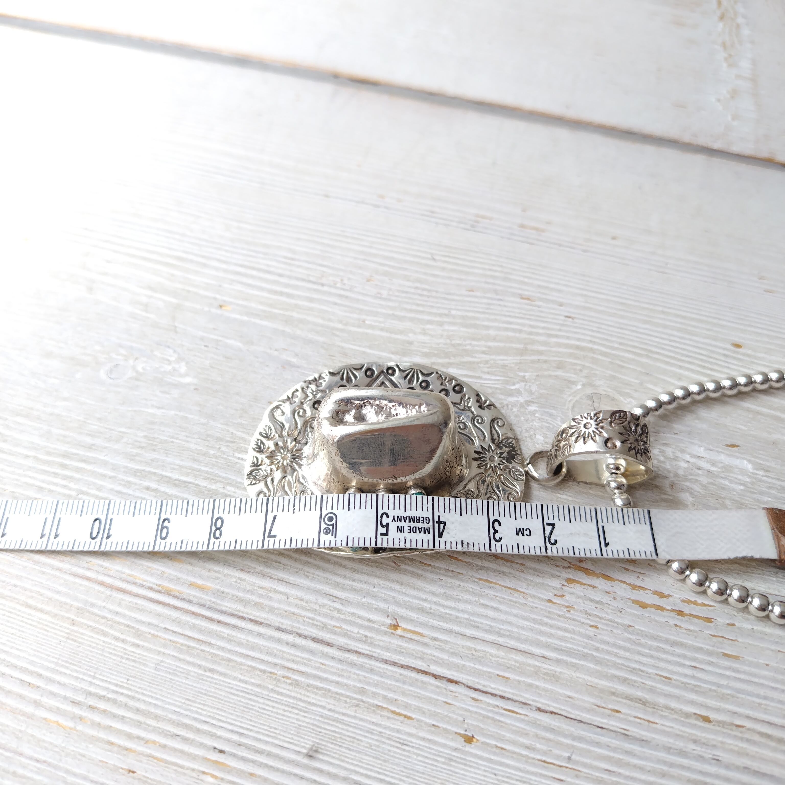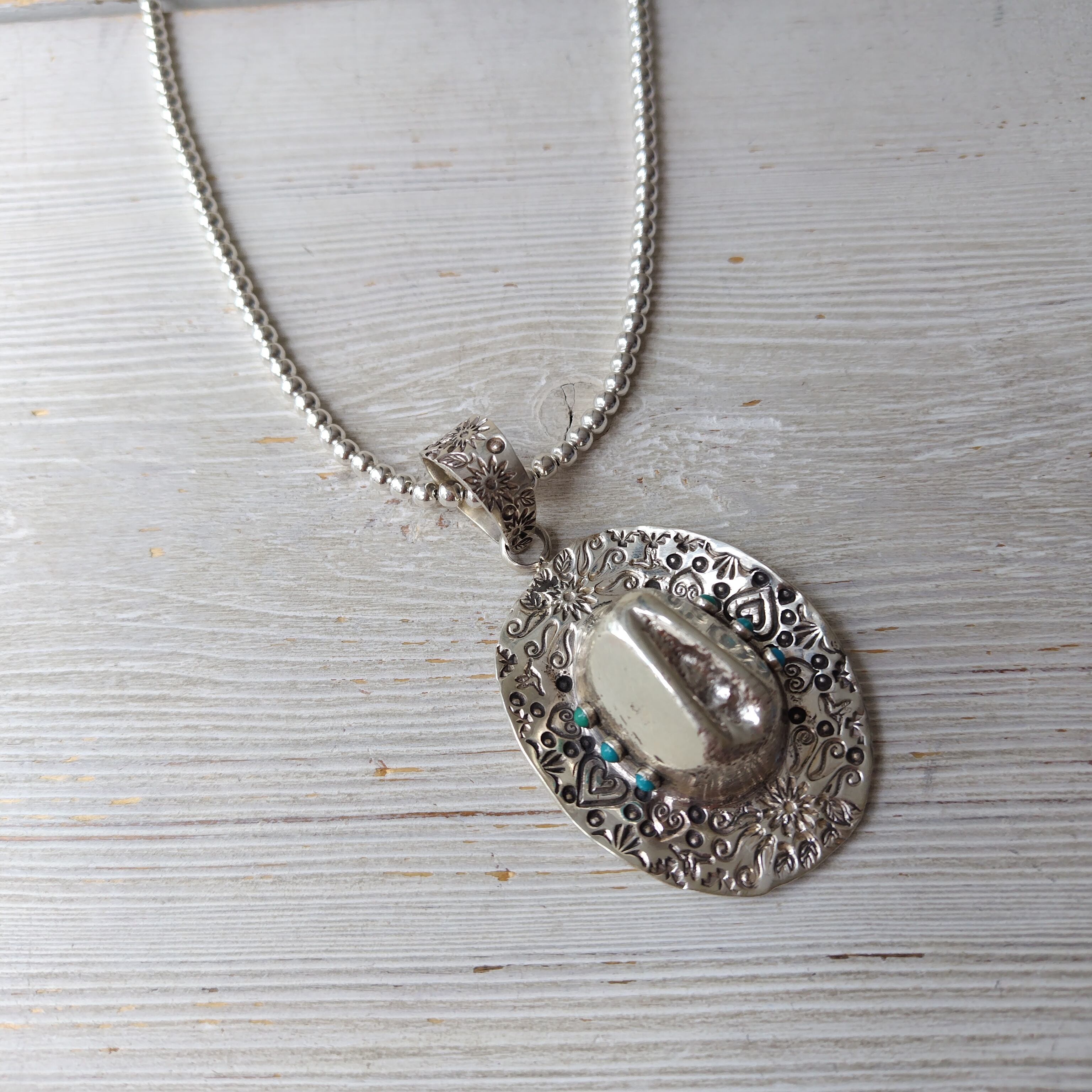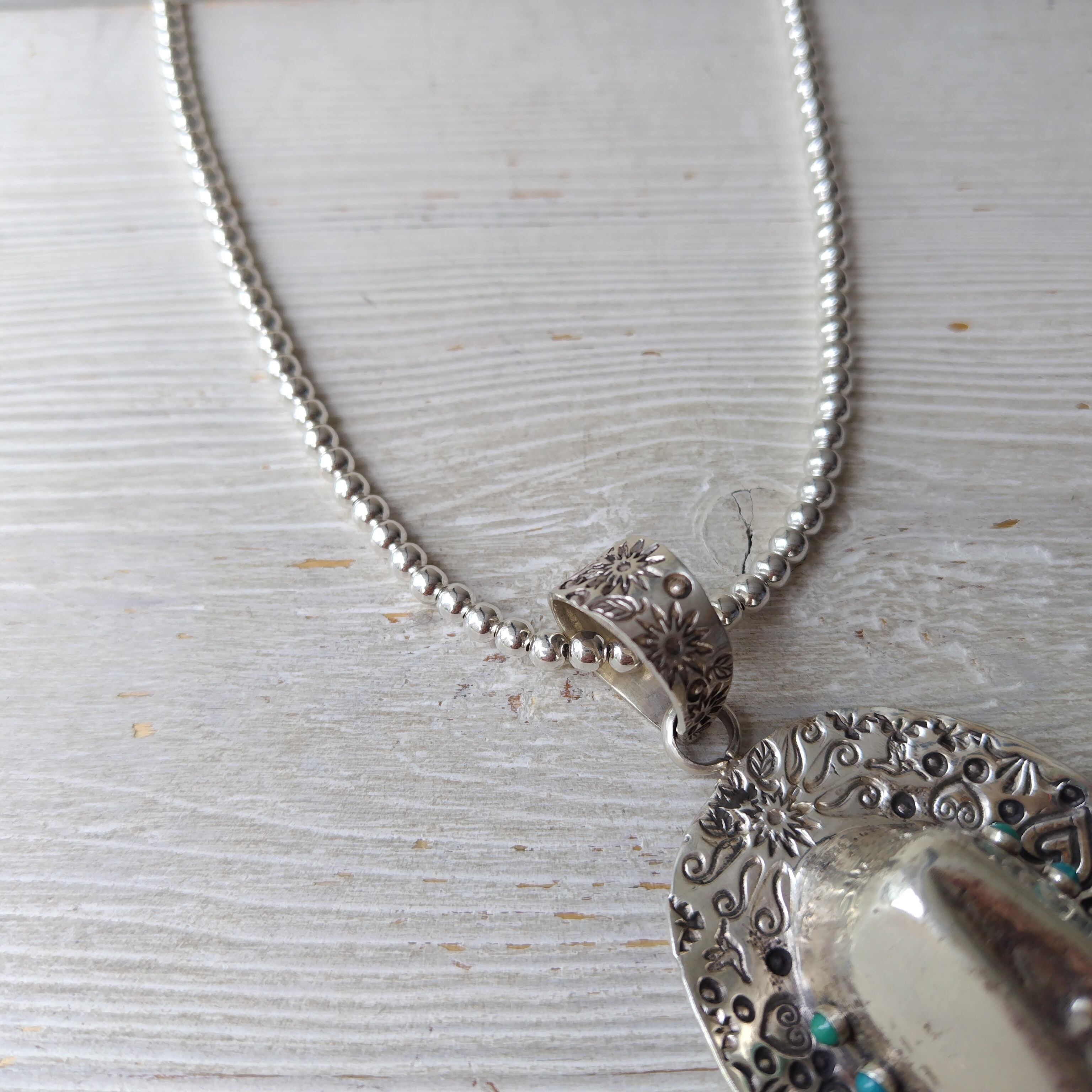 素晴らしいデザインのナバホ ウエスタンハット ターコイズ シルバートップ x 4mm玉 55cmの ナバホパール シルバーネックレスになります!