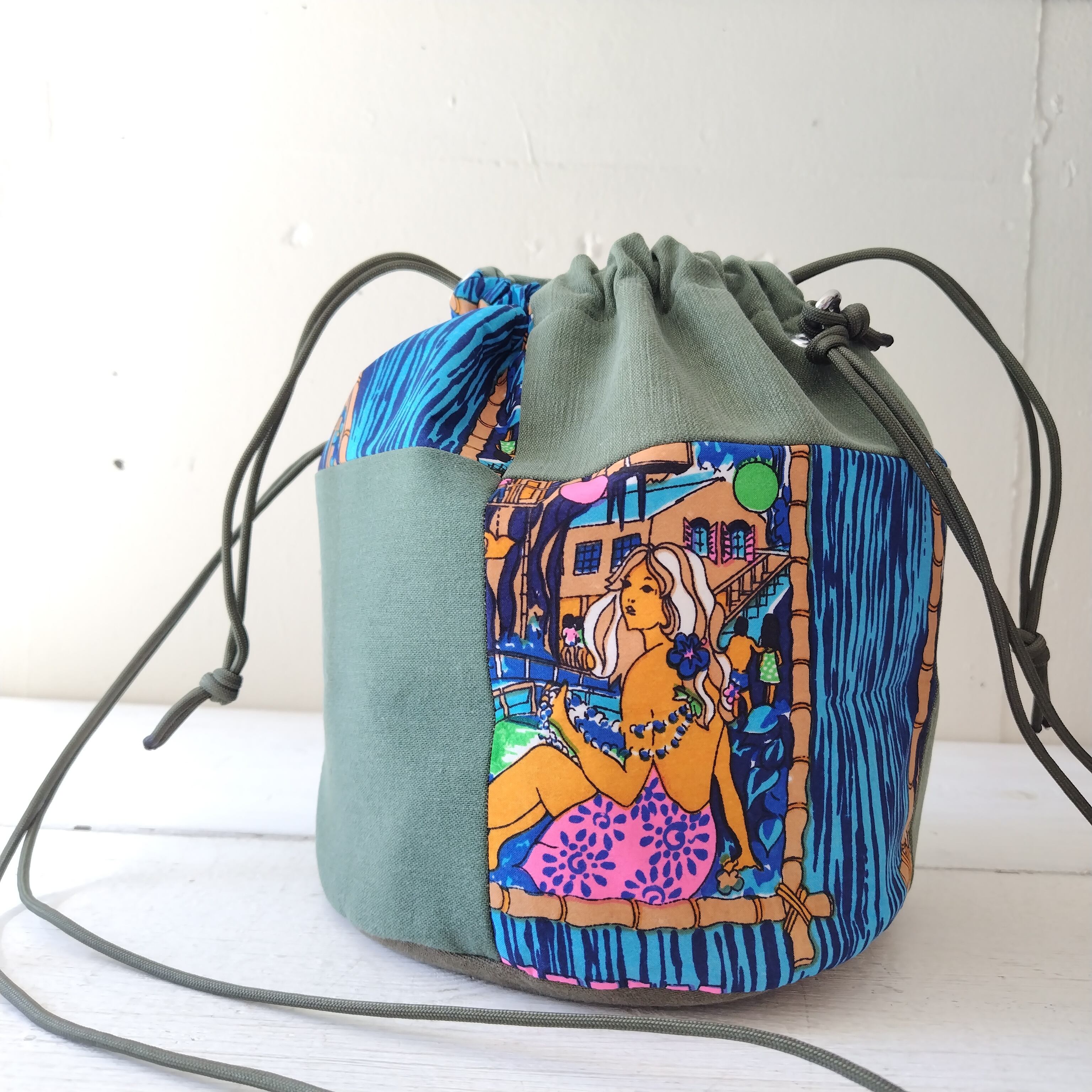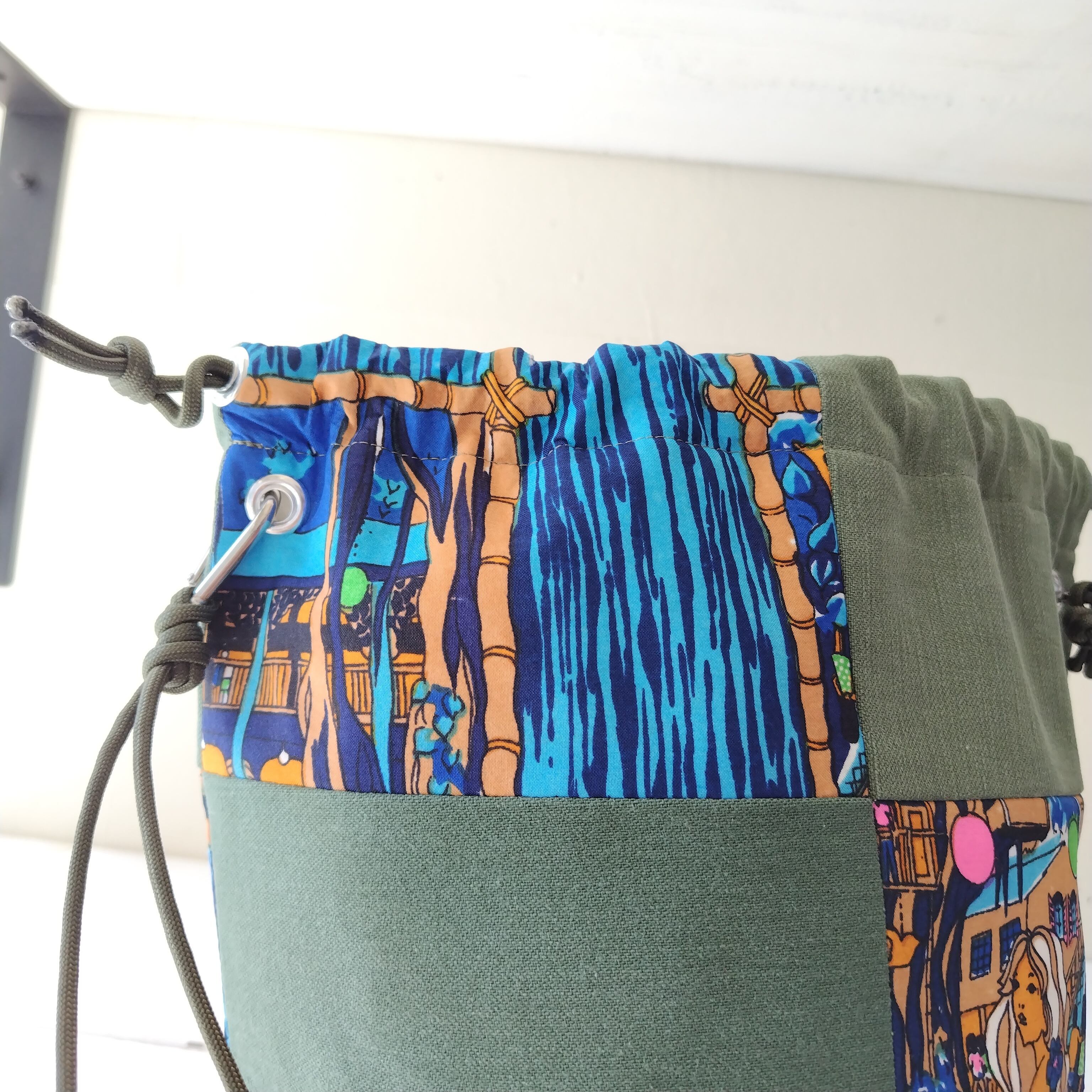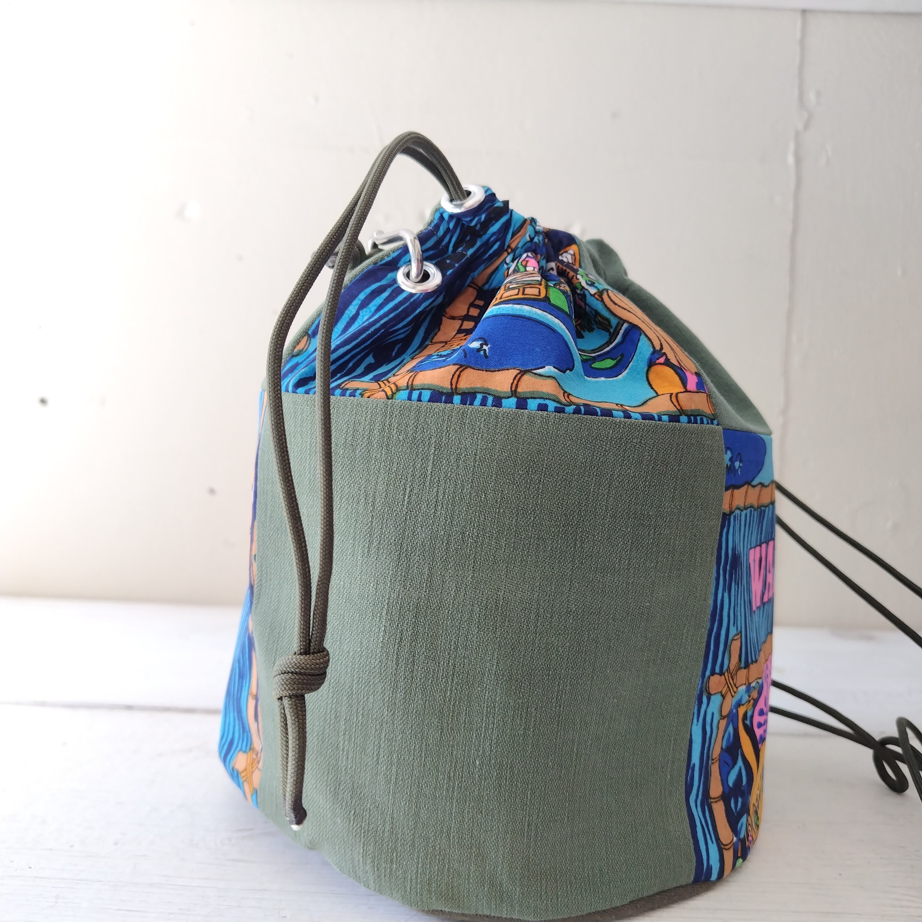 ラージサイズ ビンテージファブリック x ミリタリー パッチワーク リメイク巾着 2wayショルダーバッグ