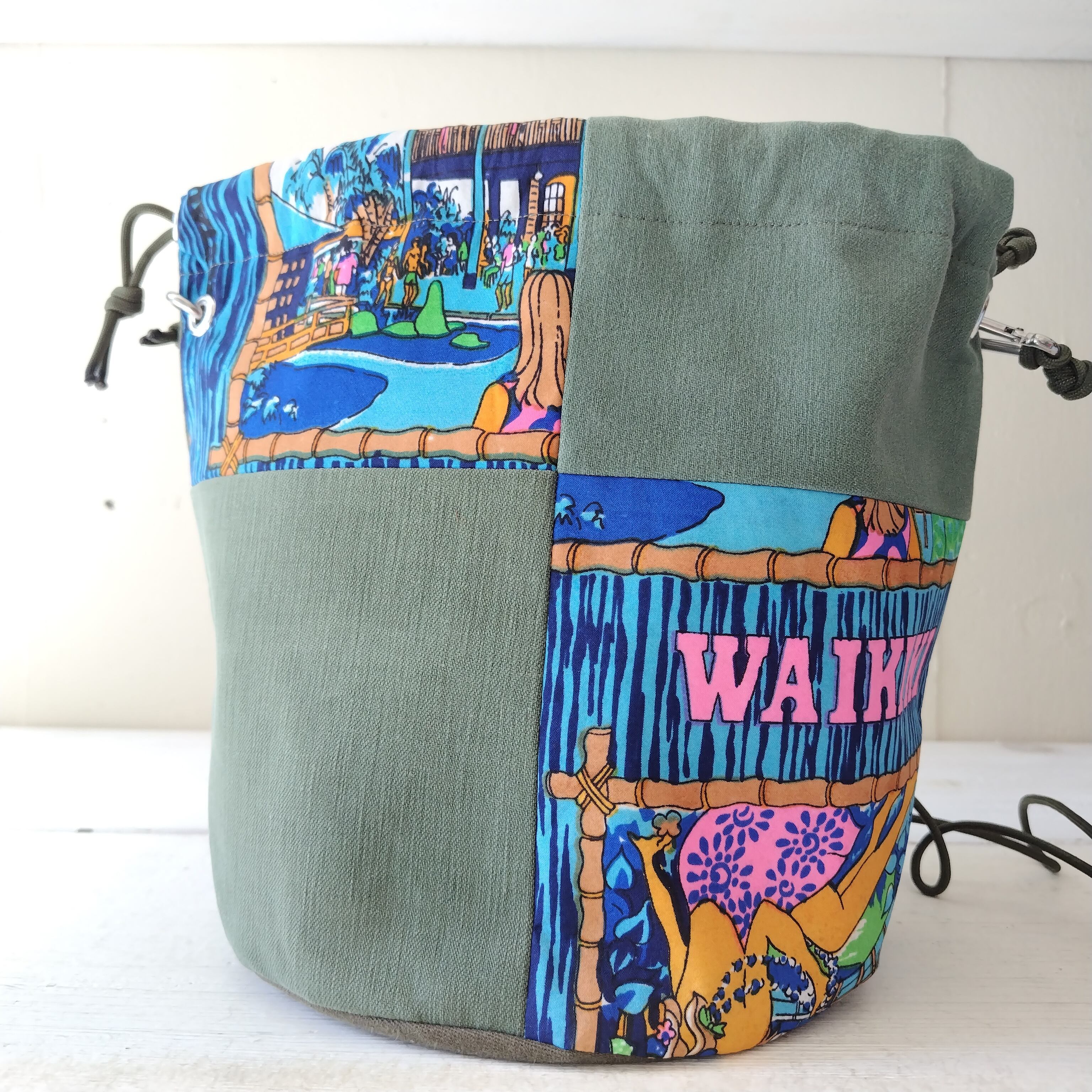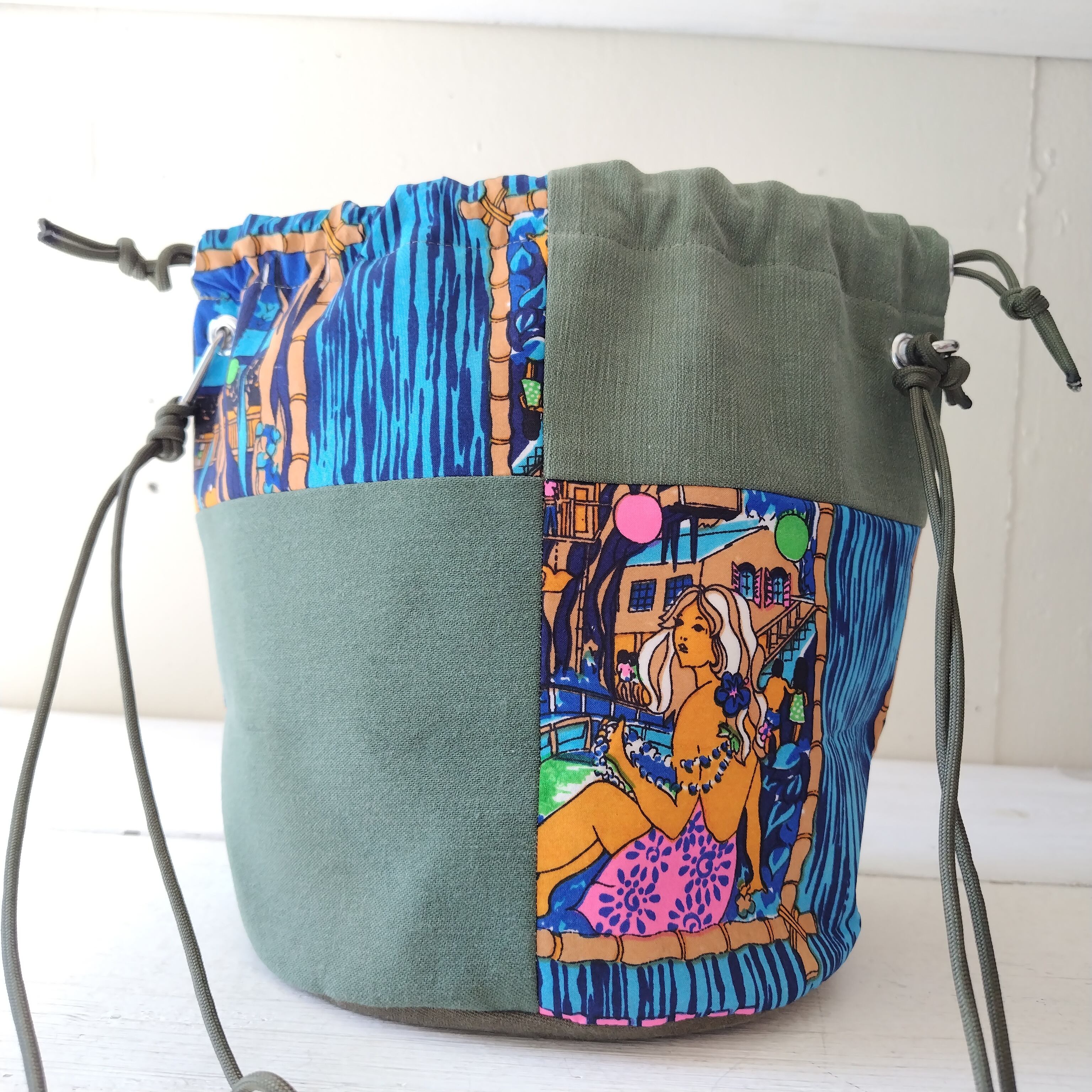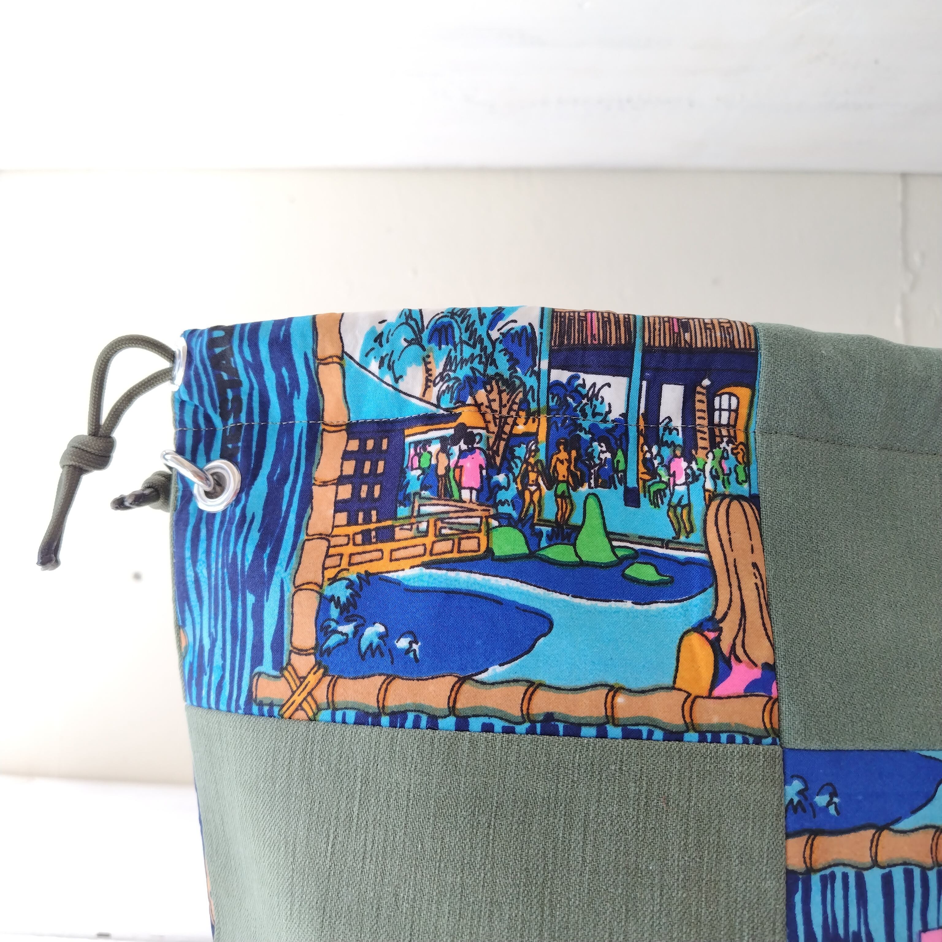 ラージサイズ ビンテージファブリック x ミリタリー パッチワーク リメイク巾着 2wayショルダーバッグ