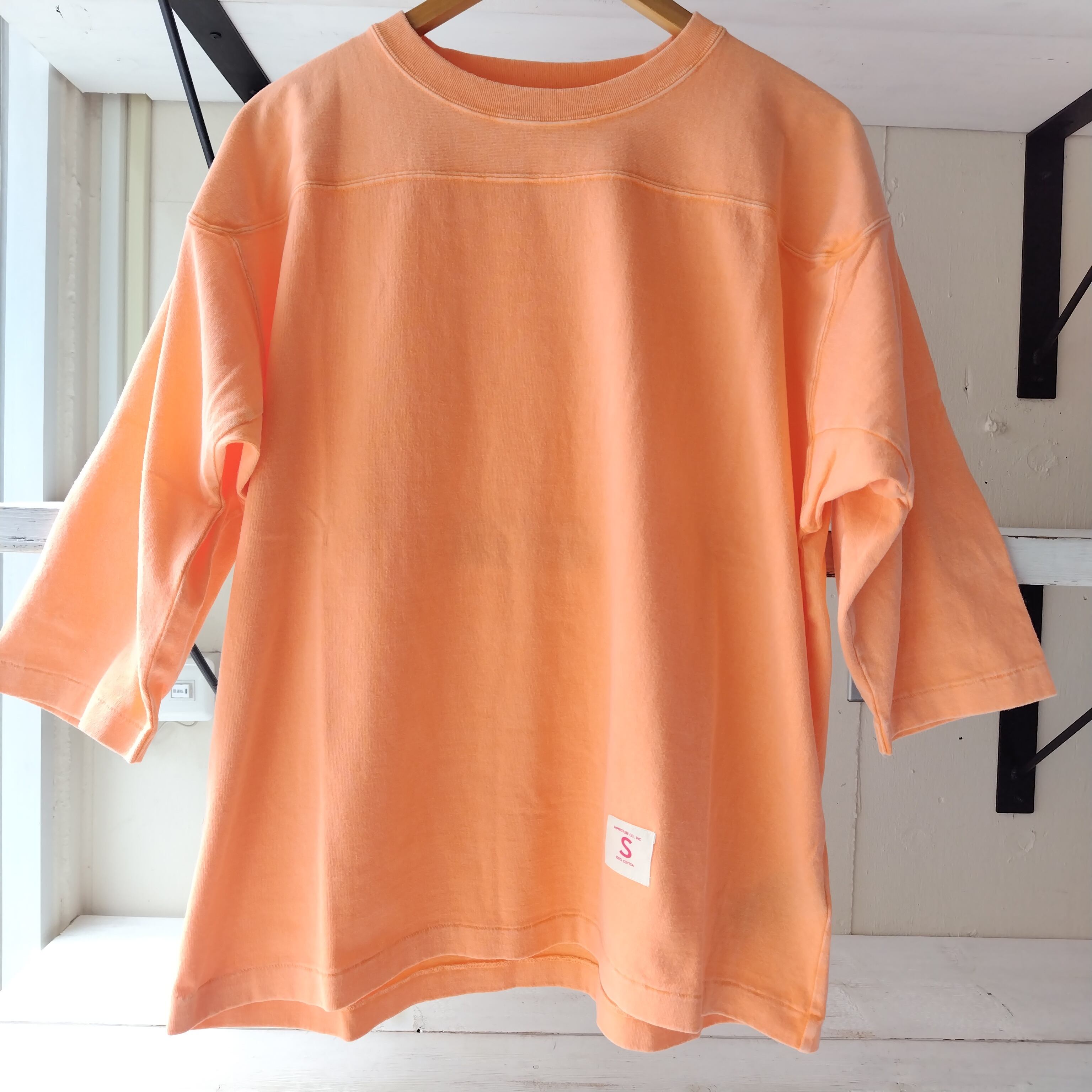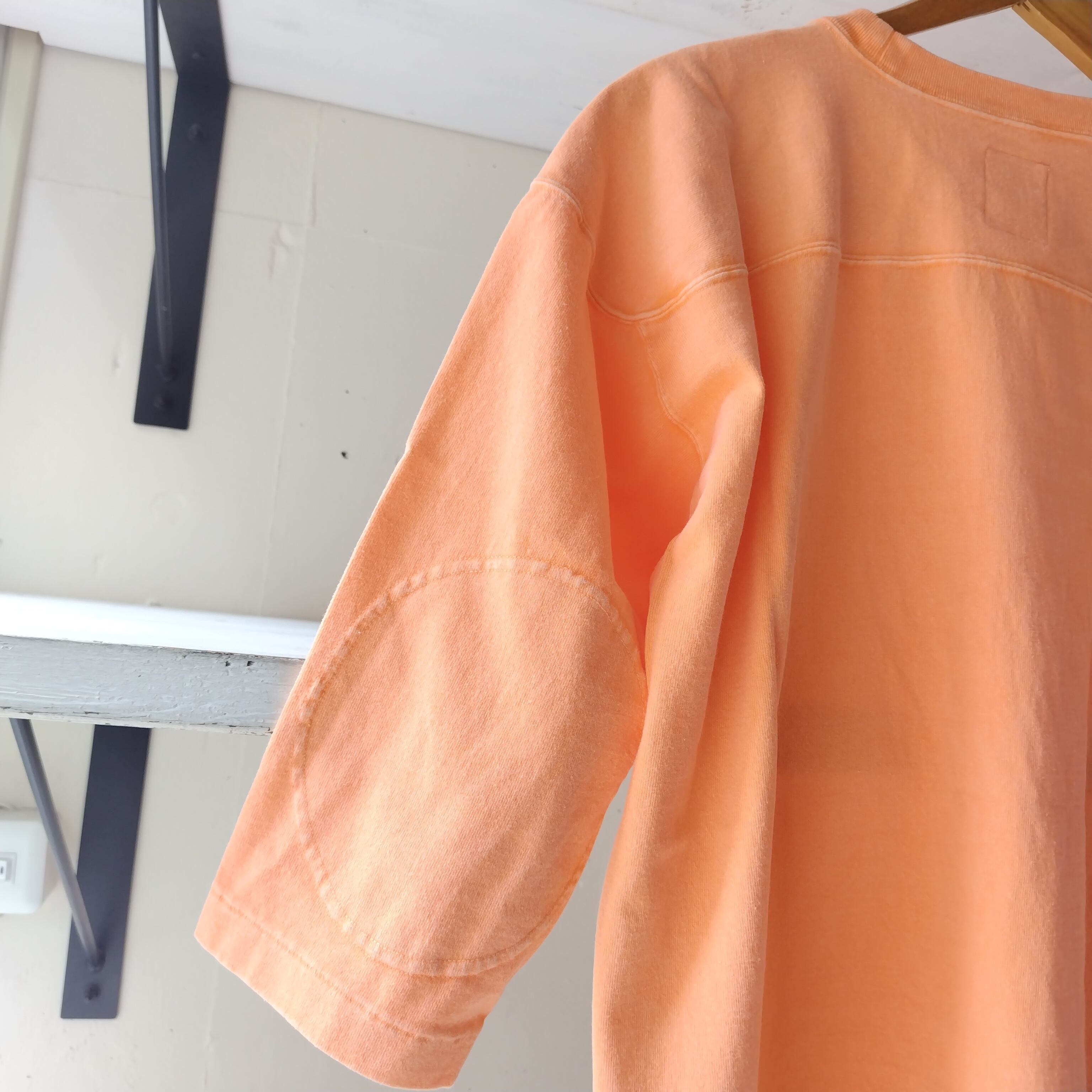 今回フットボールTシャツをサーモンオレンジにカラー別注させていただきました。