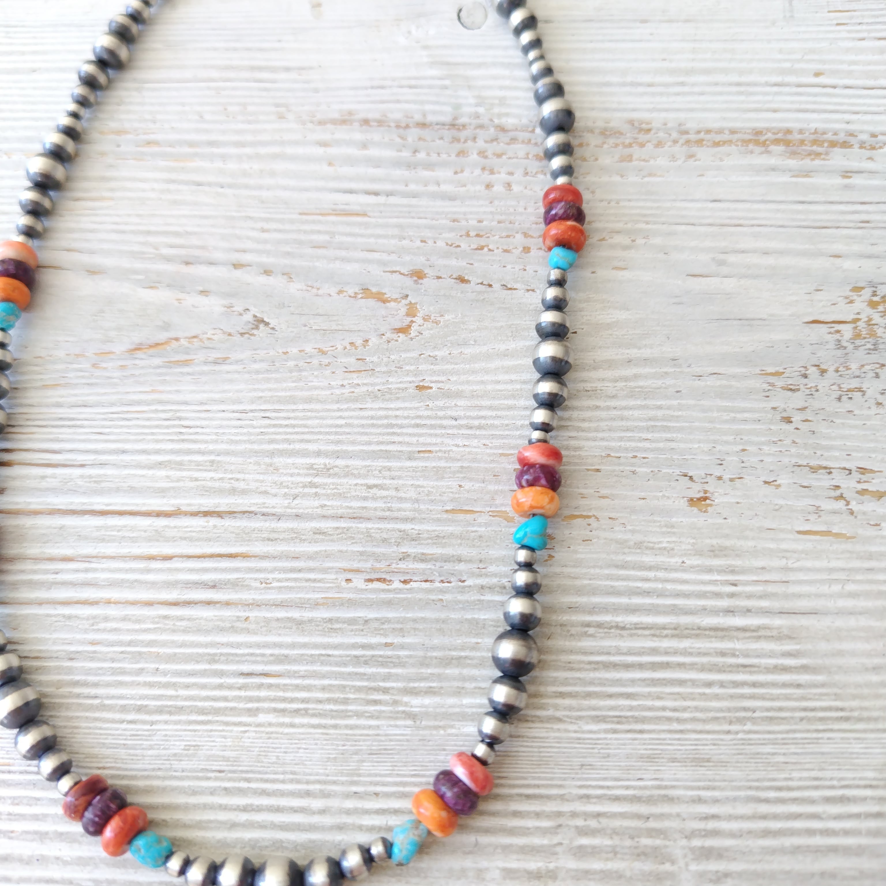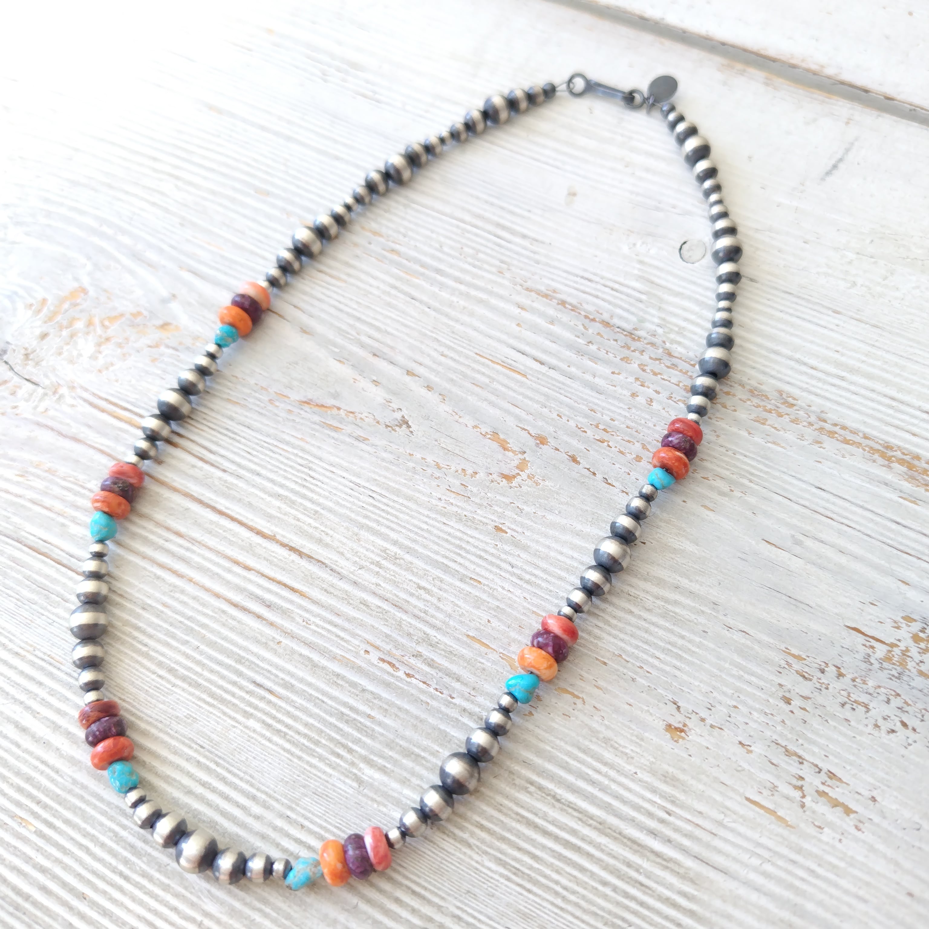 40cm ミックスストーン + ナバホパール シャイニー x 燻 シルバーネックレス インディアンジュエリー