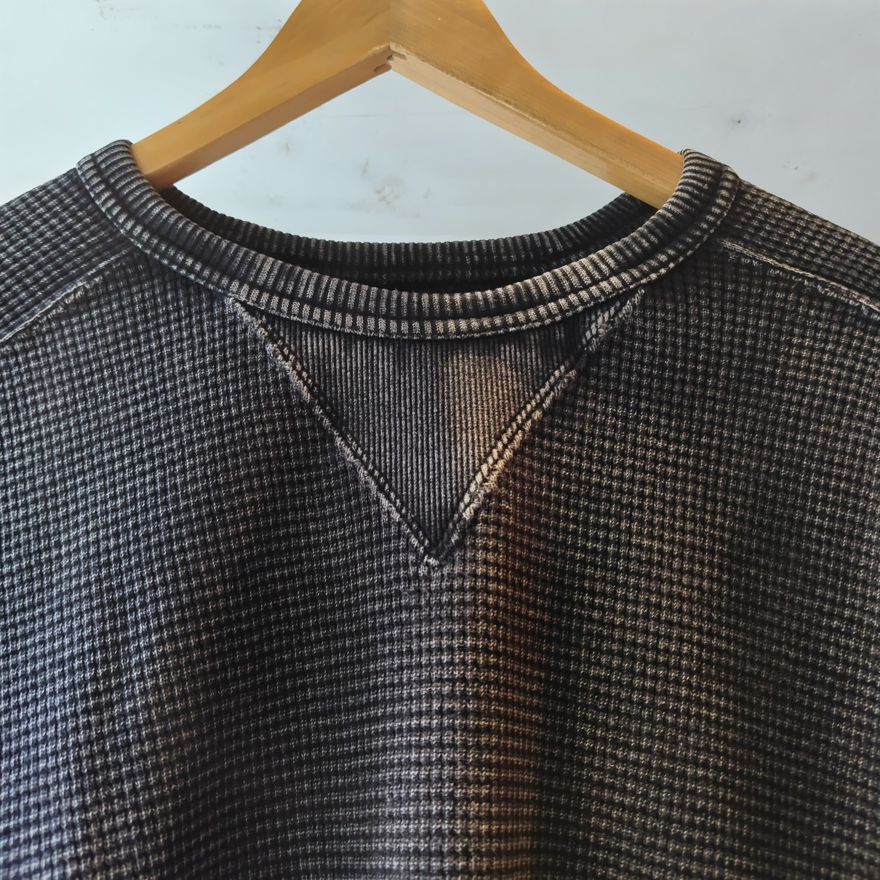 この染料を導入した結果、リアルな褪せ感とビンテージのディティールと古着で希少な素材感に1枚で着るのに嬉しい緩めのサイジングがドンピシャに融合して、ありそうで無いサーマルロンTが完成しました。