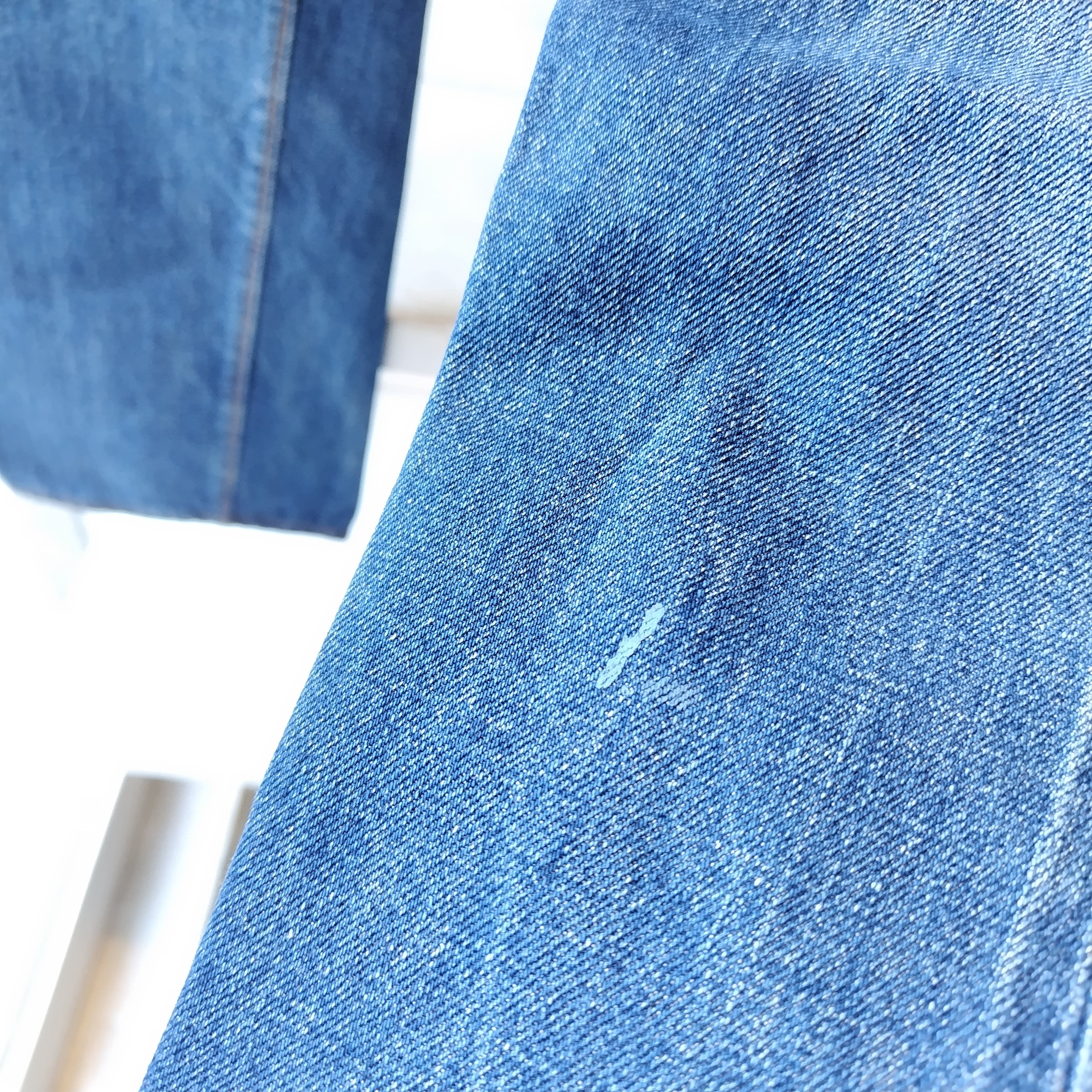 洗いこんだ感、微量のペンキとびとシミ、小さいリペア、ポケット裏生地にくすみがございます。
