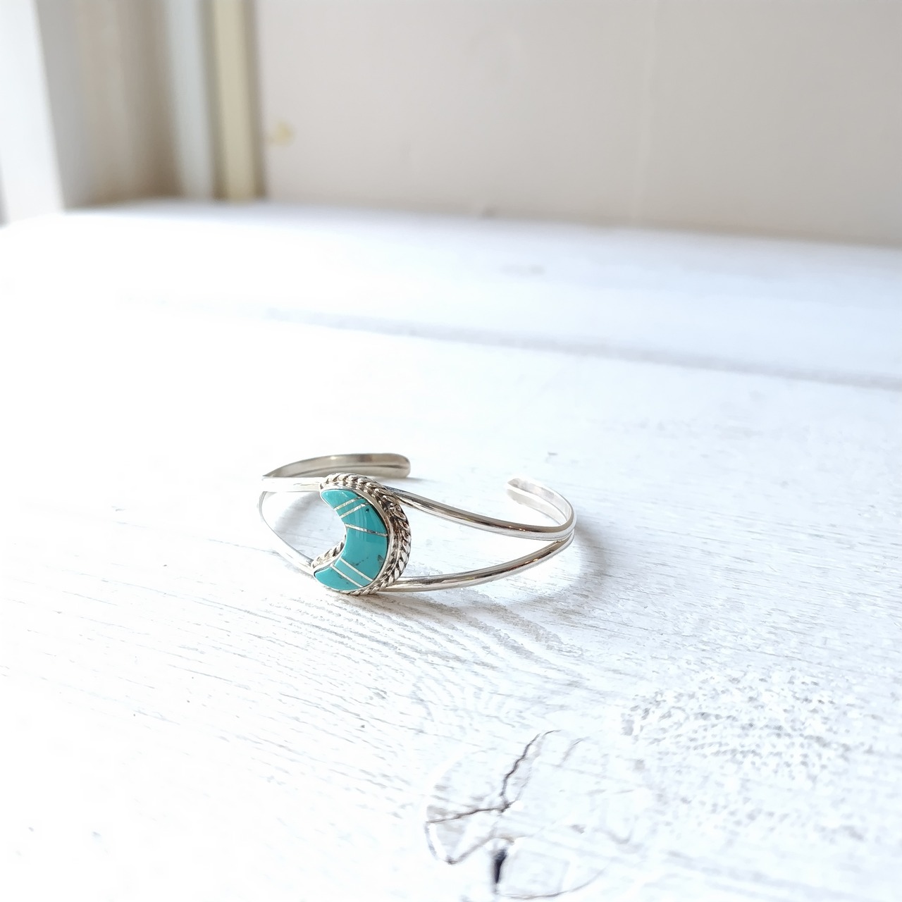 素晴らしいデザインの ナバホ 三日月 ターコイズ シルバー バングルになります!