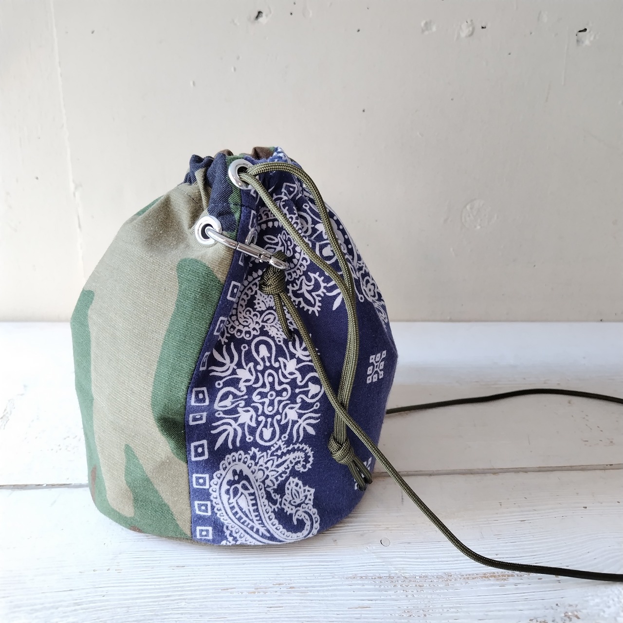 バンダナ パッチワーク x カモフラージュ リメイク巾着 2wayショルダーバッグ