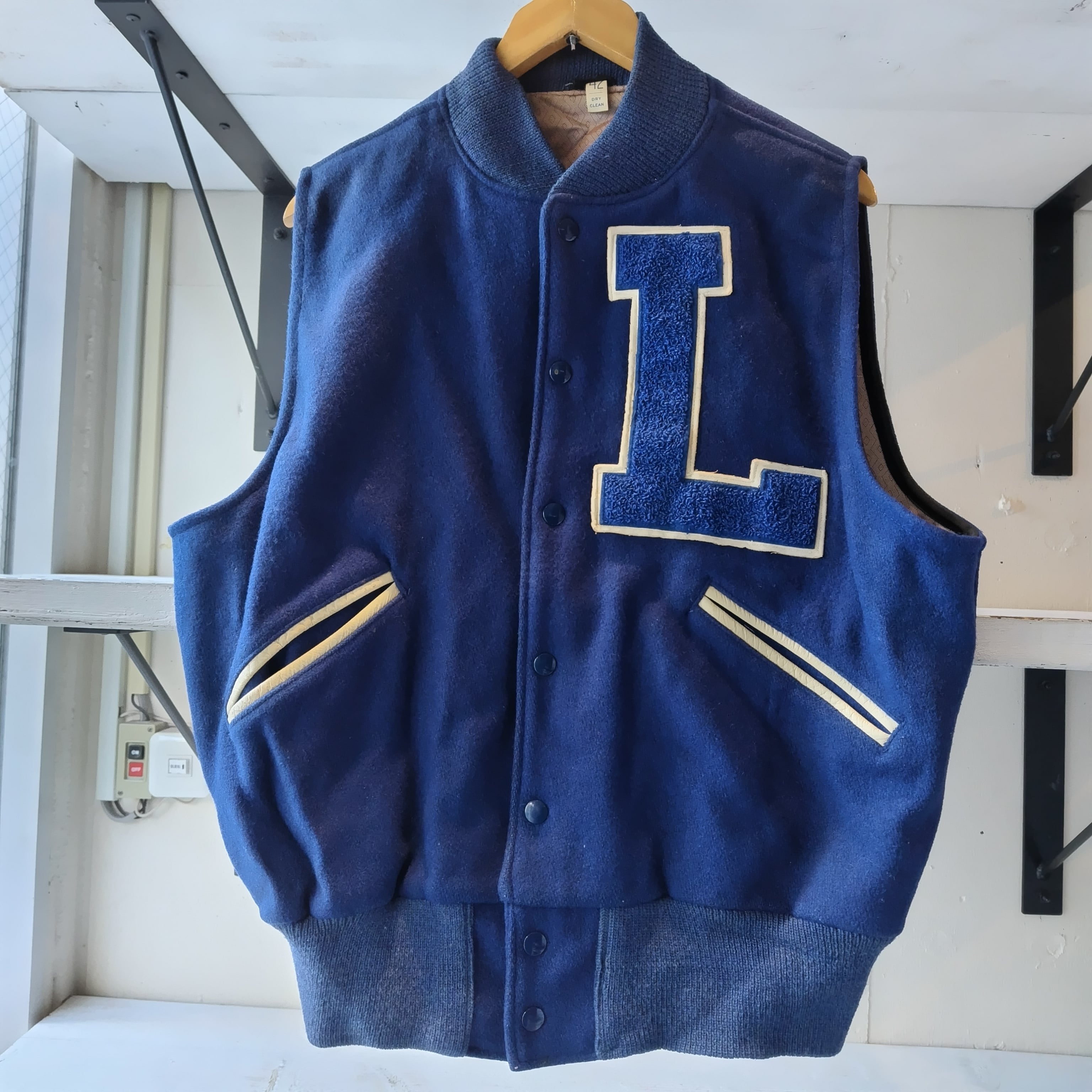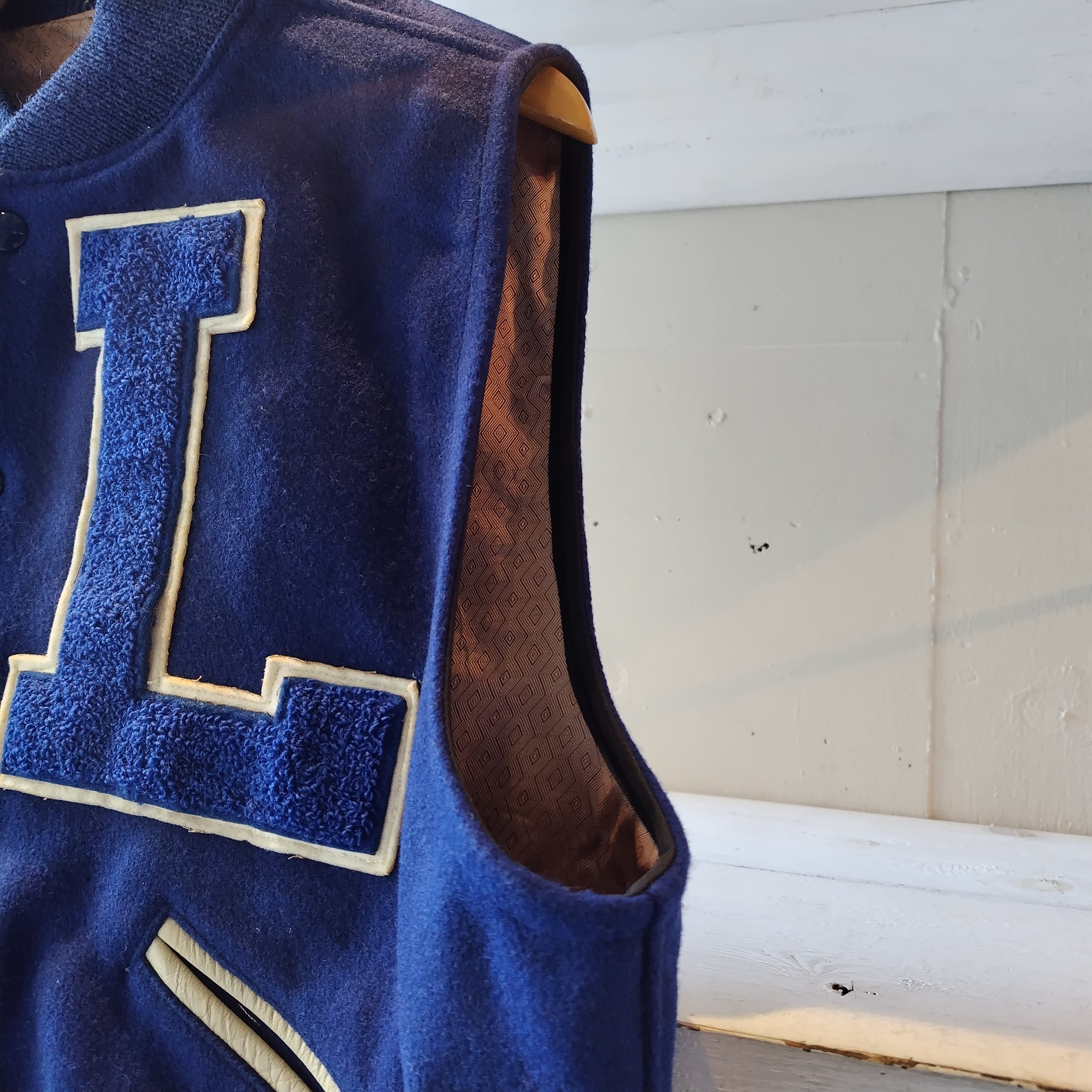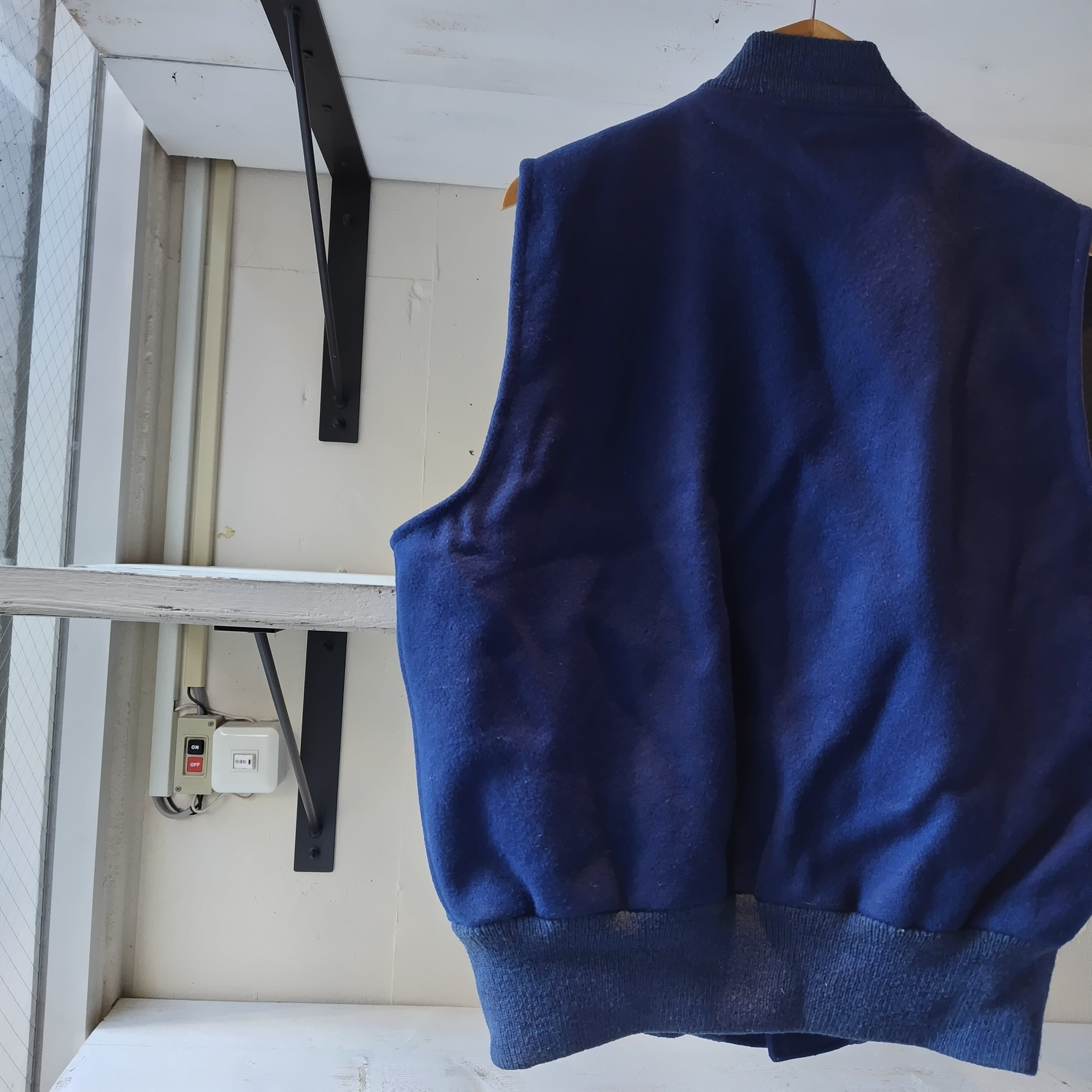 袖を取ってベストにしてあります。洗いこんだ感、微量の生地の毛羽立ち、襟リブにうっすらシミ、裏生地にシミと落書き、袖リブに若干の毛羽立ちがございますが雰囲気が勝ってるかと思います!
