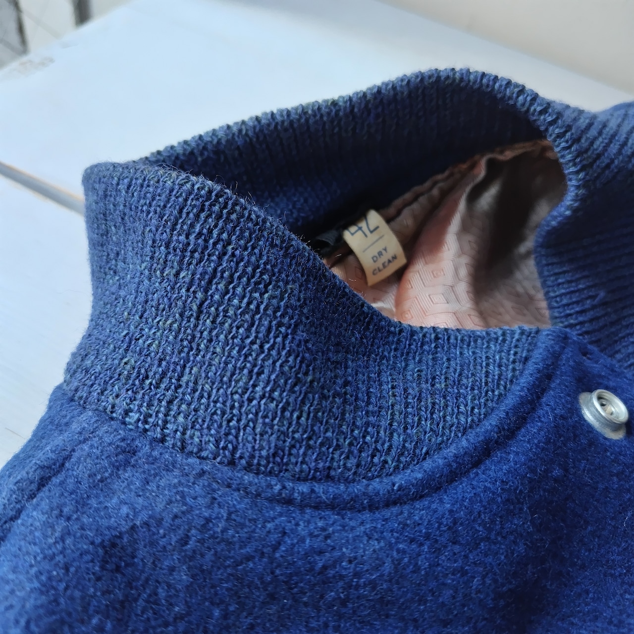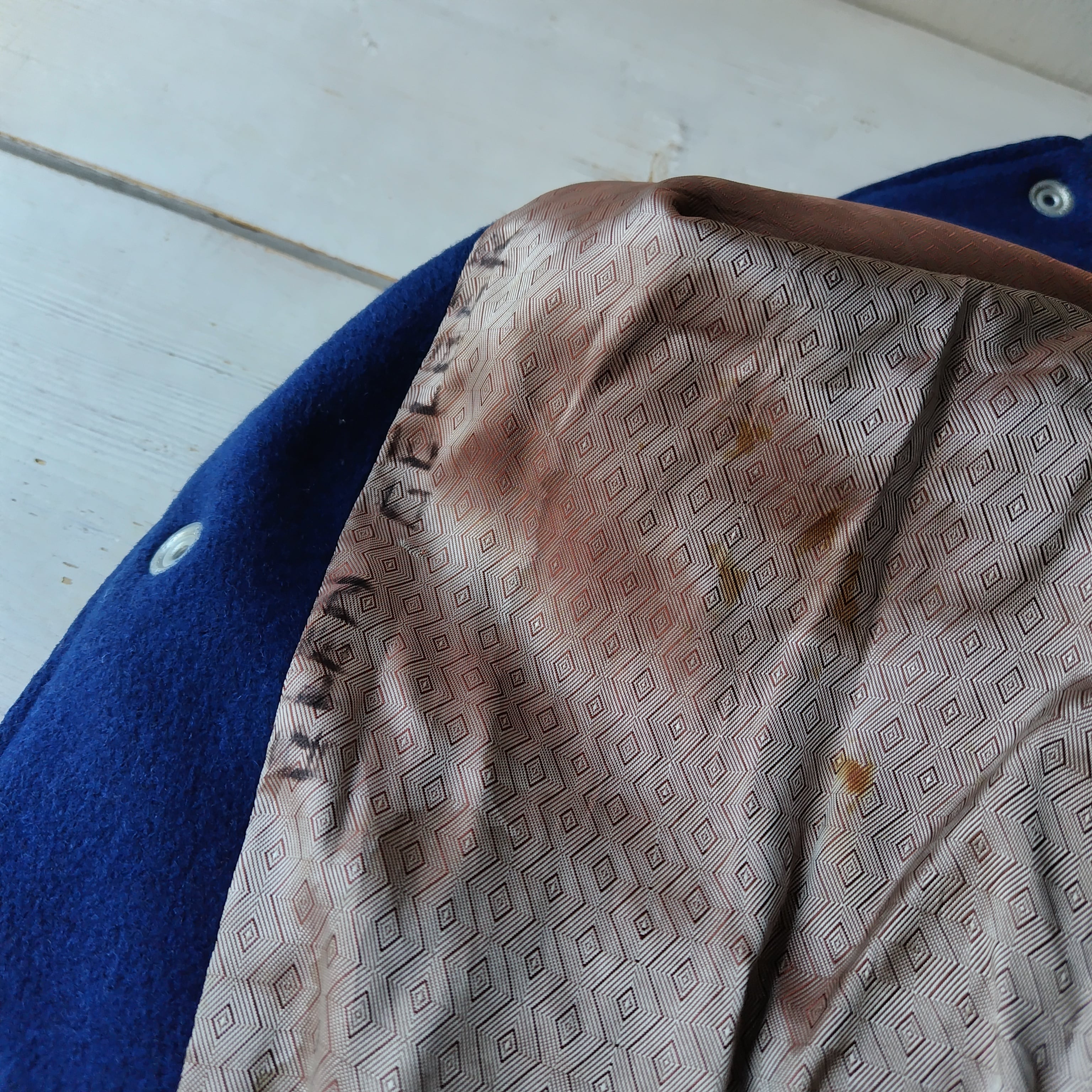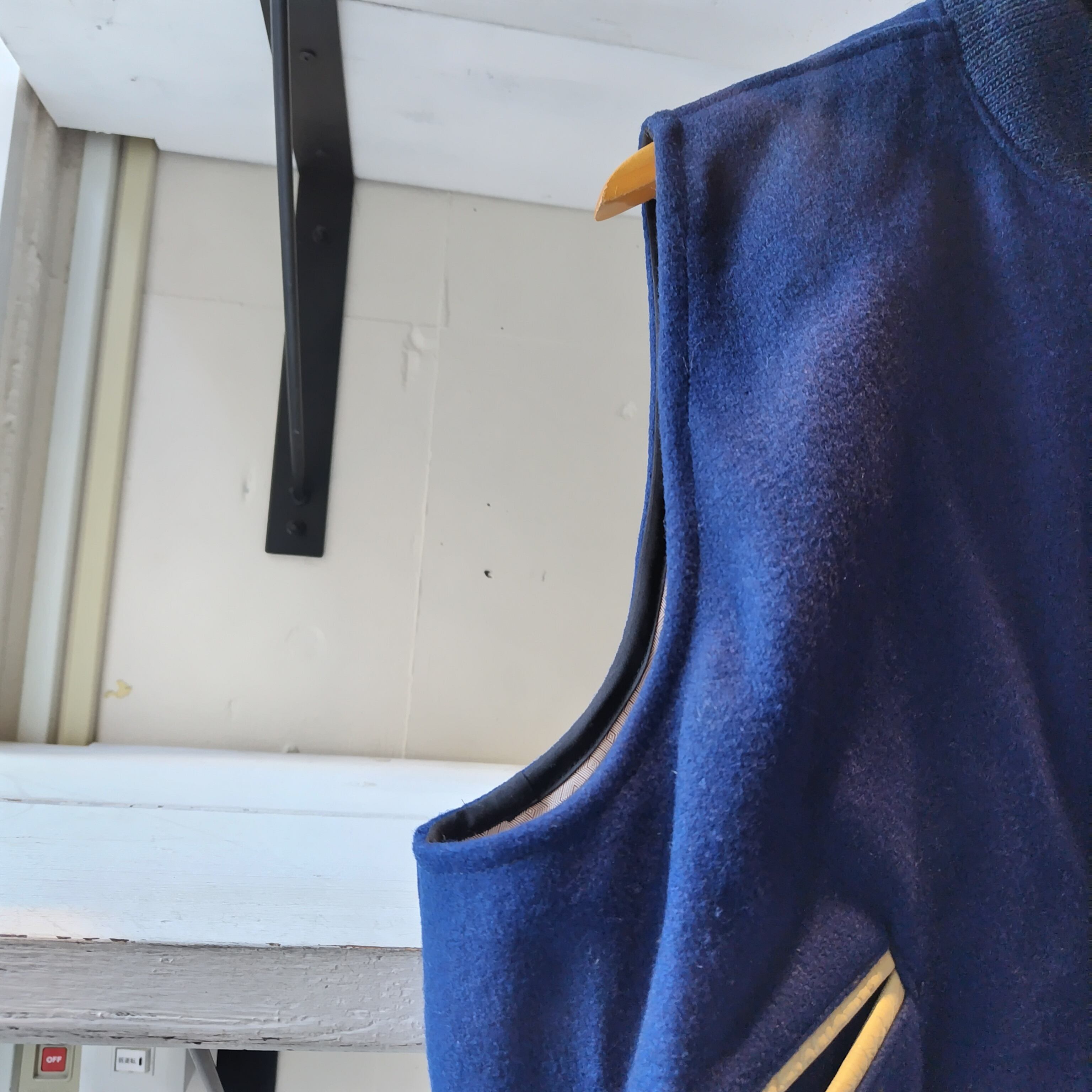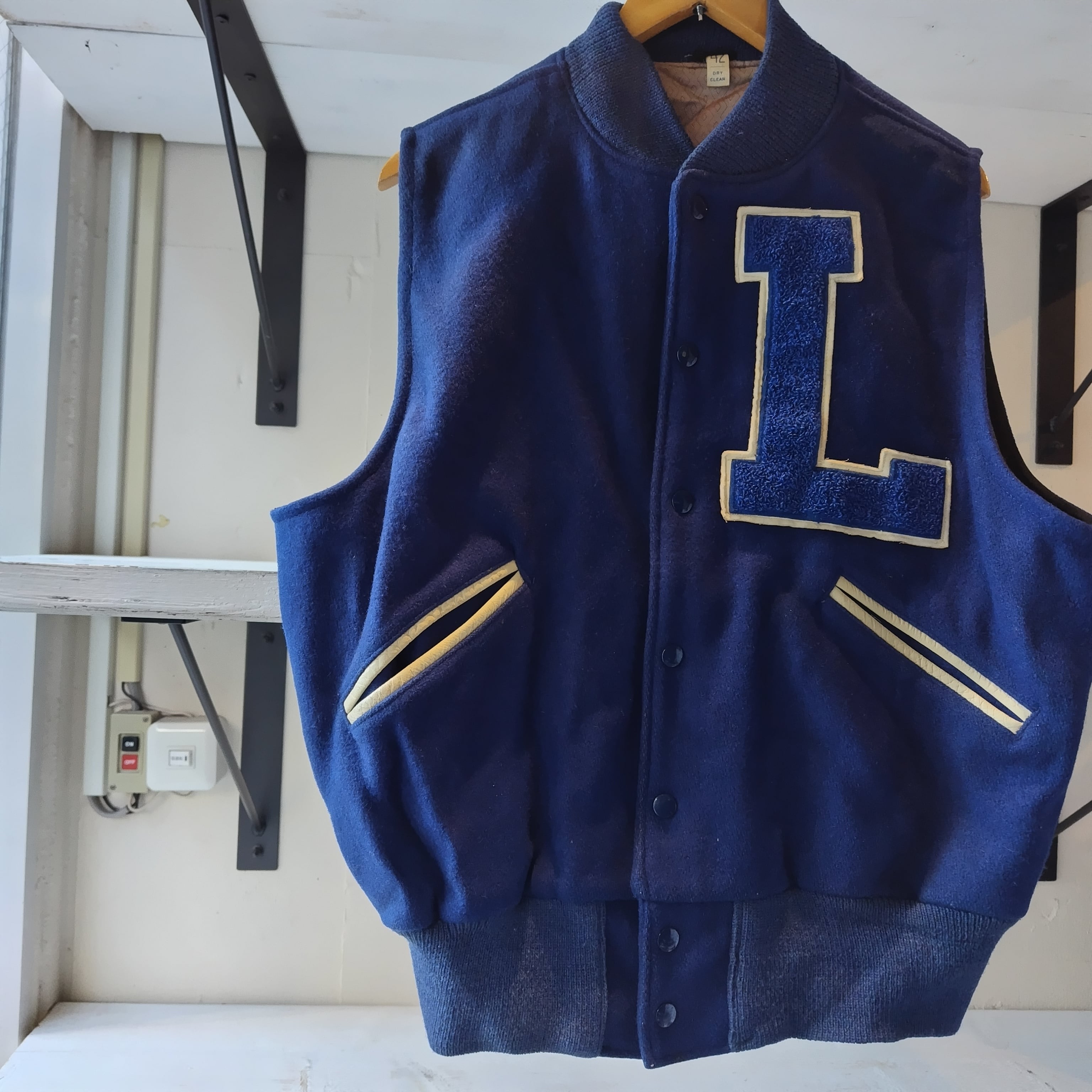 袖を取ってベストにしてあります。洗いこんだ感、微量の生地の毛羽立ち、襟リブにうっすらシミ、裏生地にシミと落書き、袖リブに若干の毛羽立ちがございますが雰囲気が勝ってるかと思います!