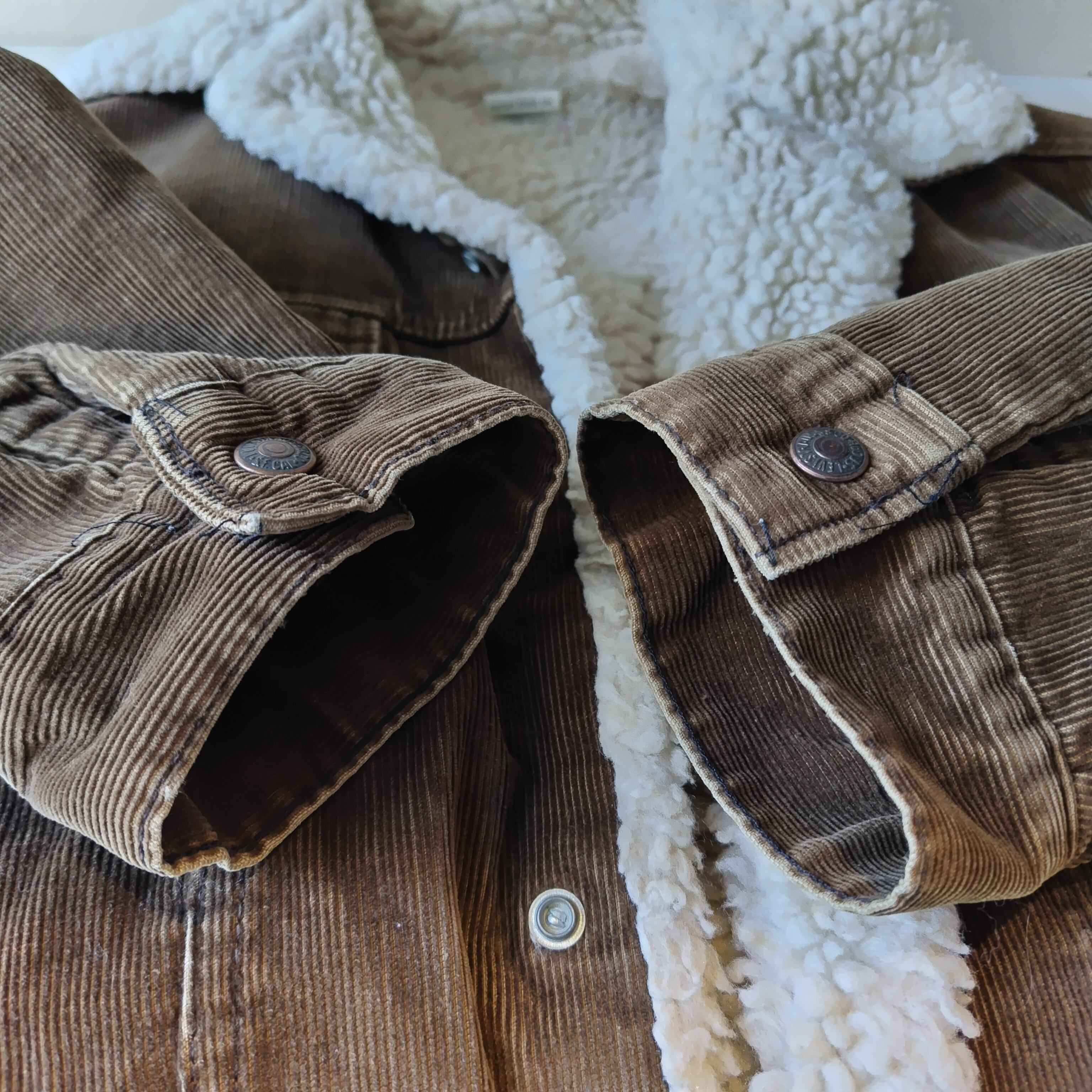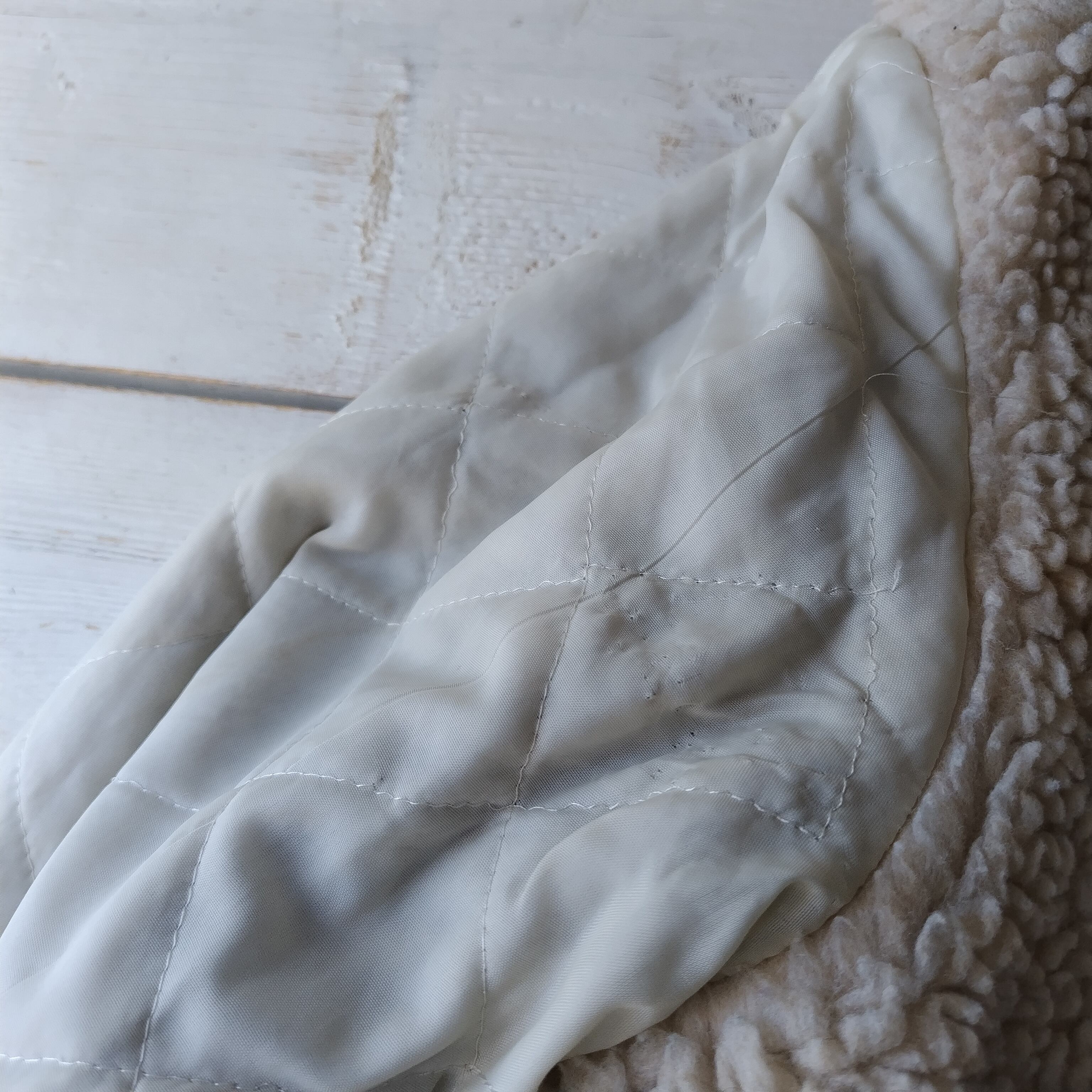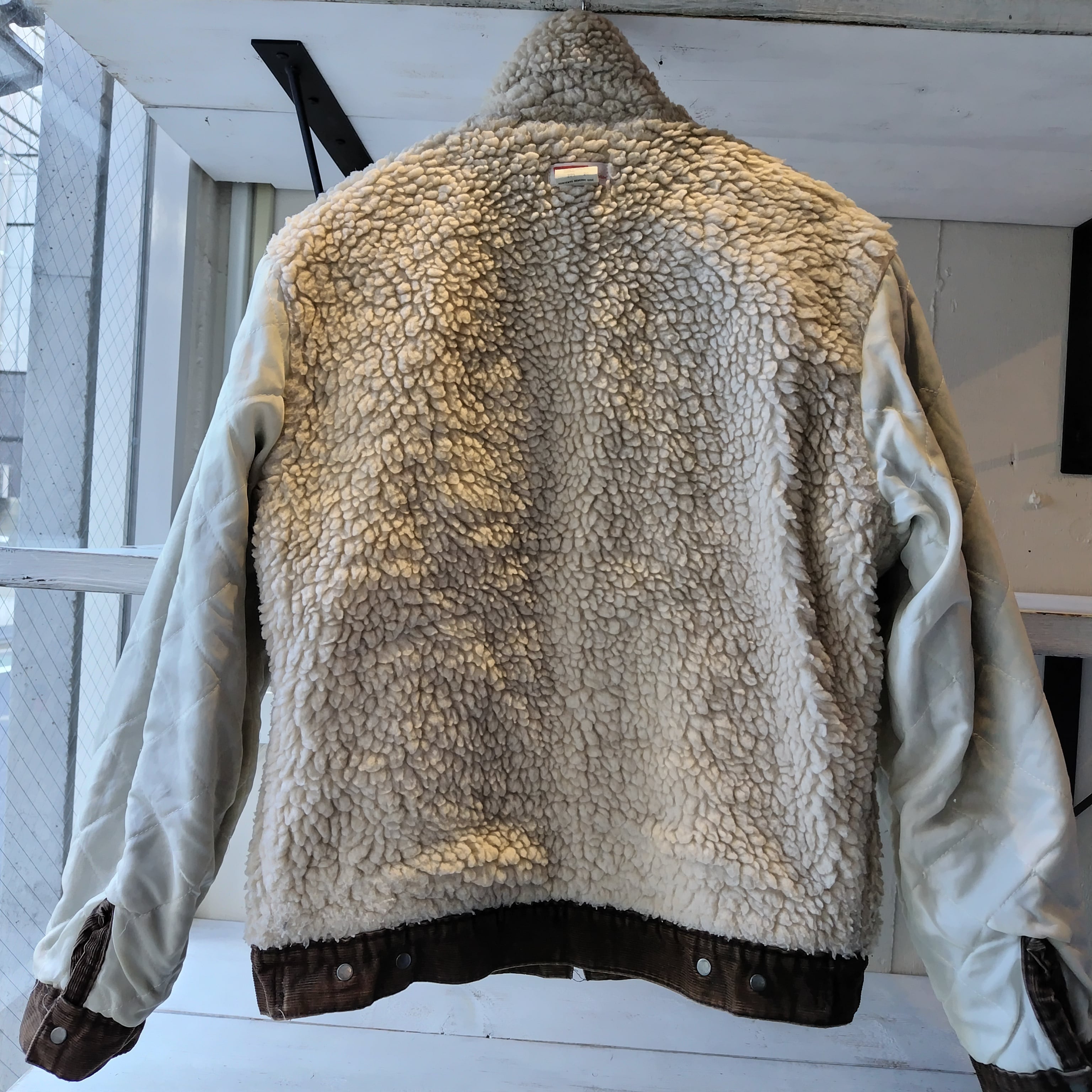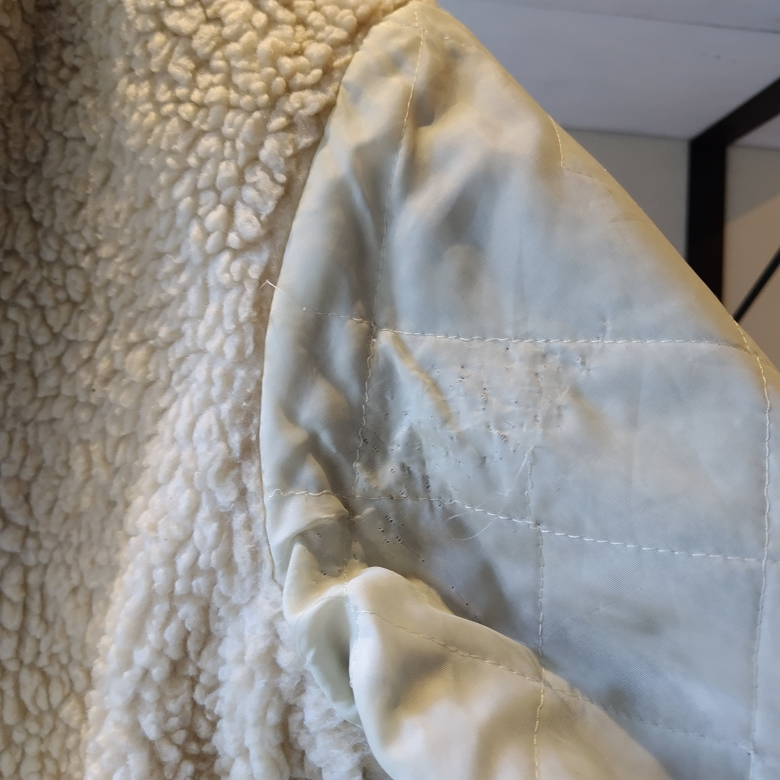 洗いこんだ感、中のボアに毛羽立ちとツブレ、袖の裏地に糸とびと細かいダメージがございます。