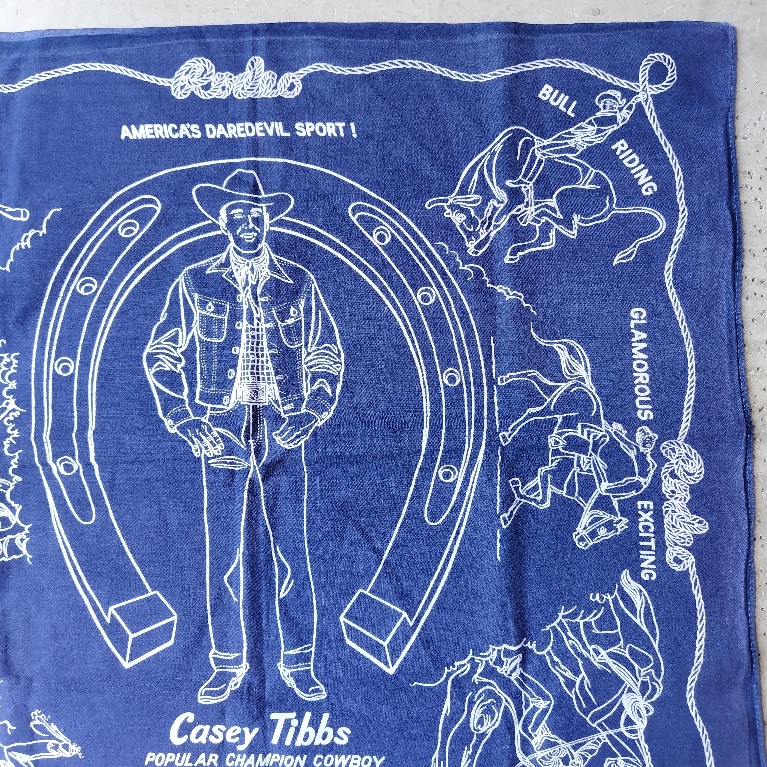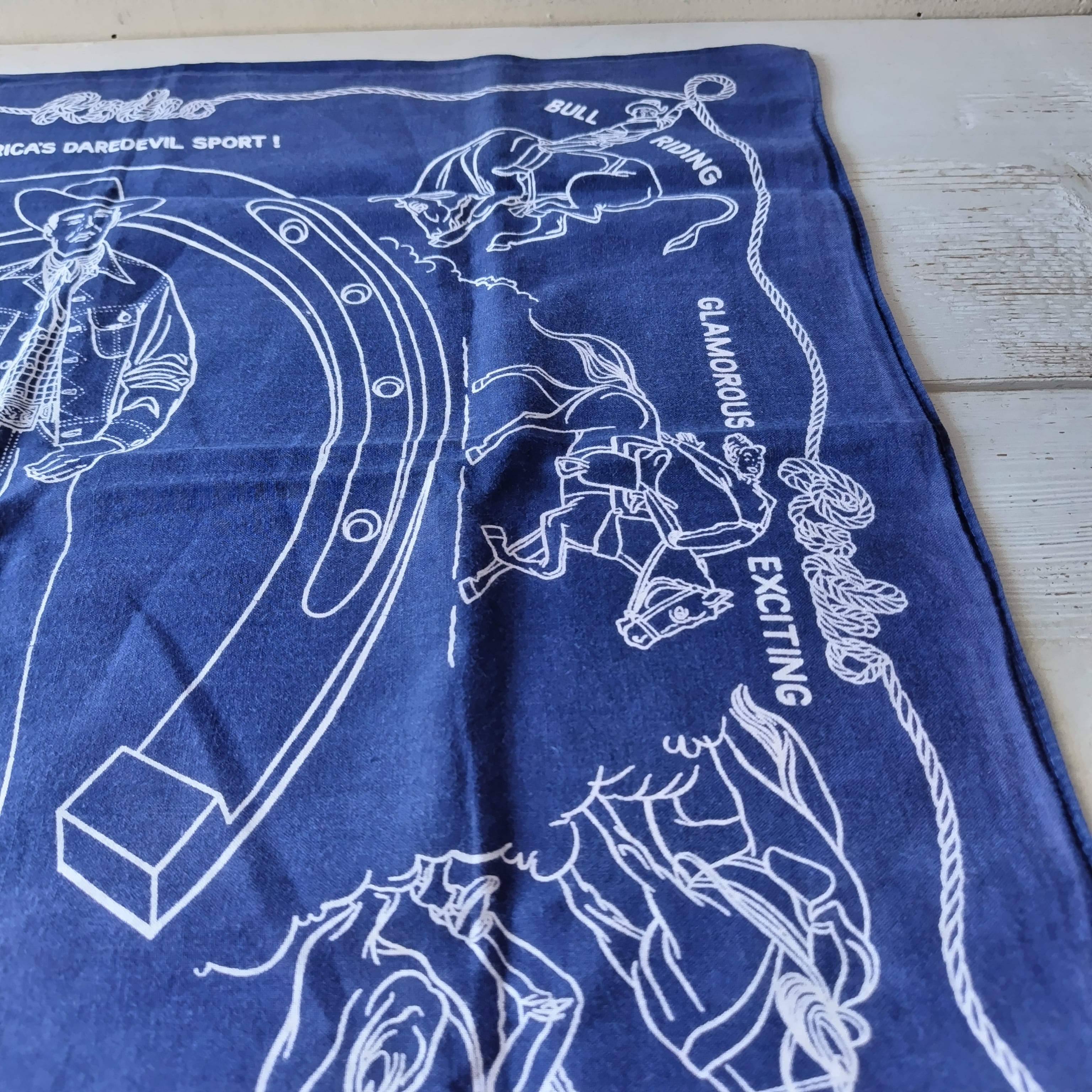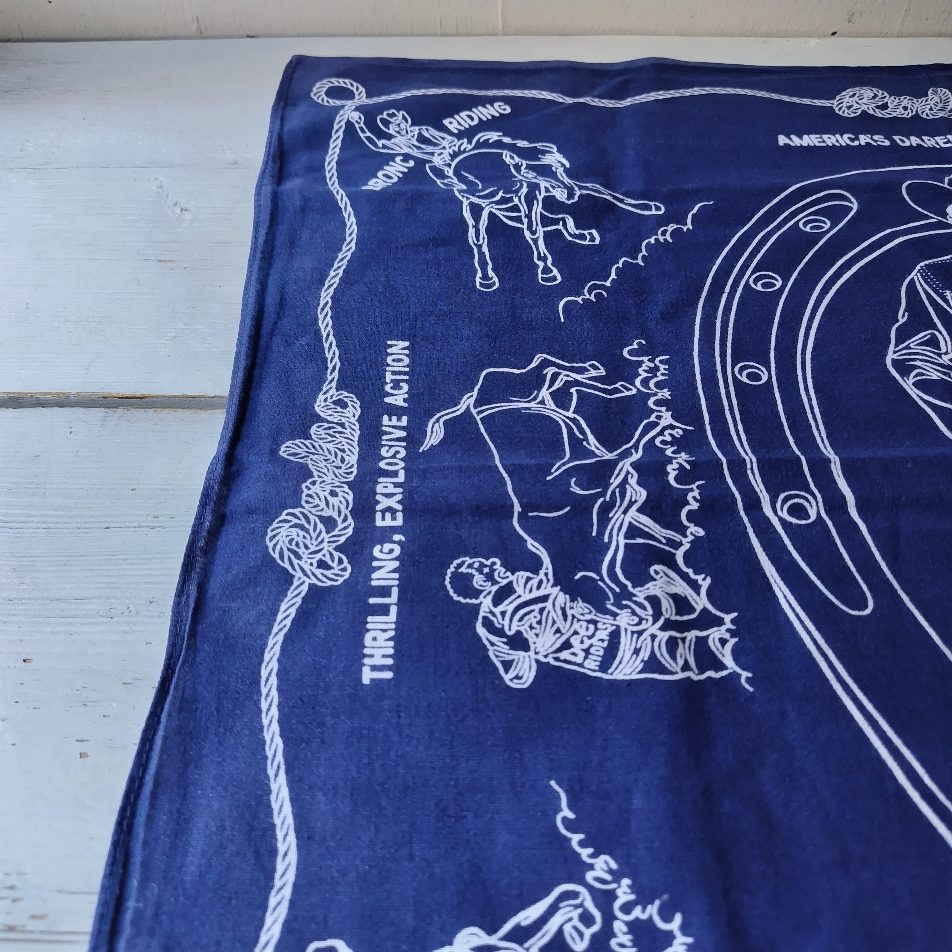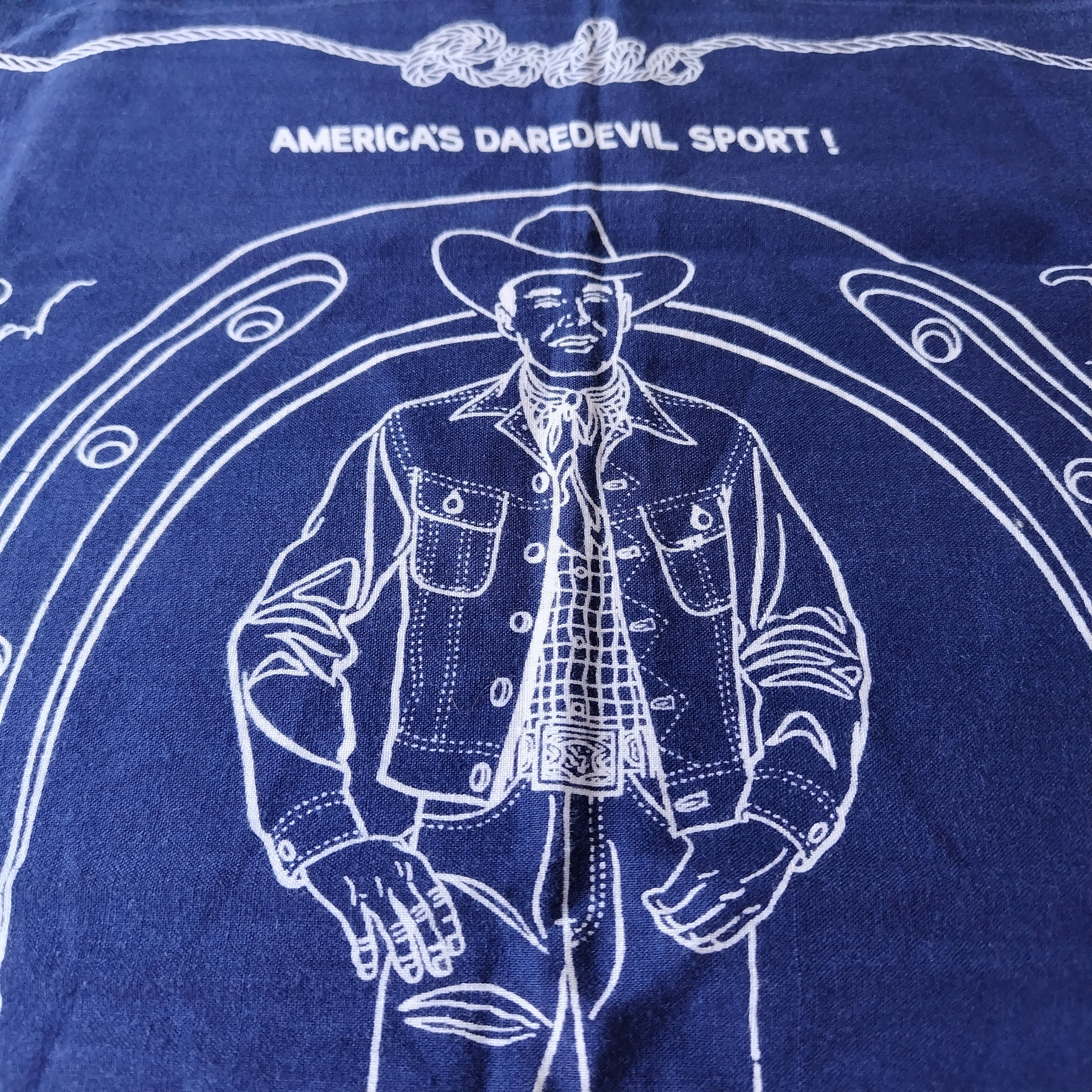 バンダナには「STEER WRESTLING」「BRONC RIDING」「BULL RIDING」「CALF ROPING」といったロデオ競技の様子や、「AMERICA'S DAREDEVIL SPORT!」などのテキストがデザインされています。
