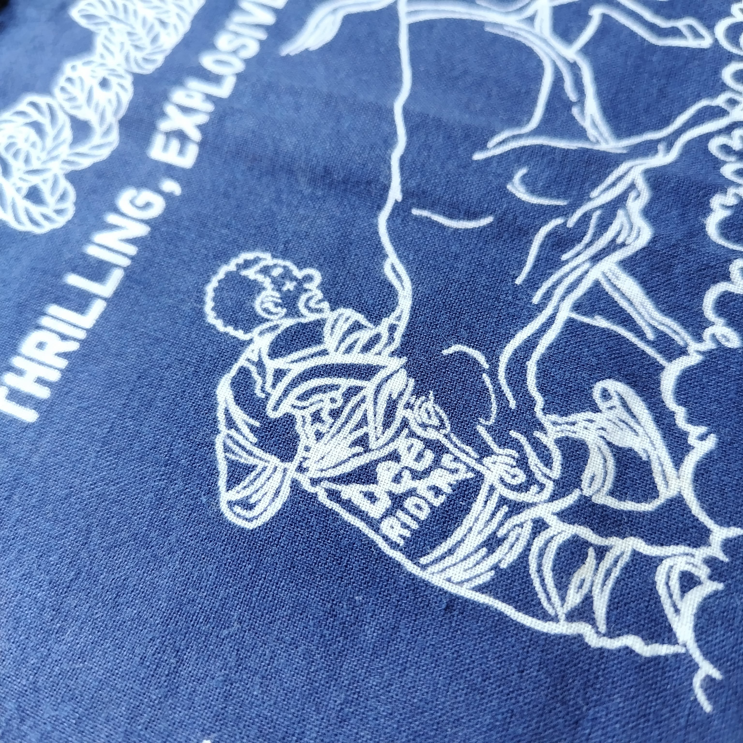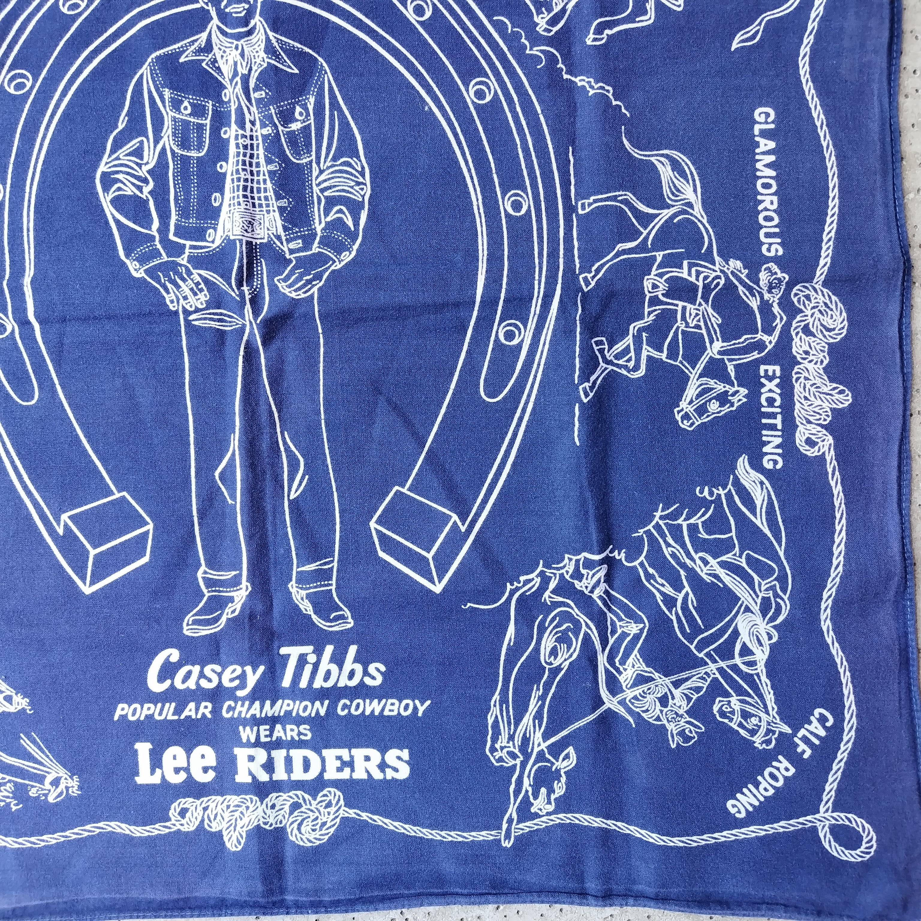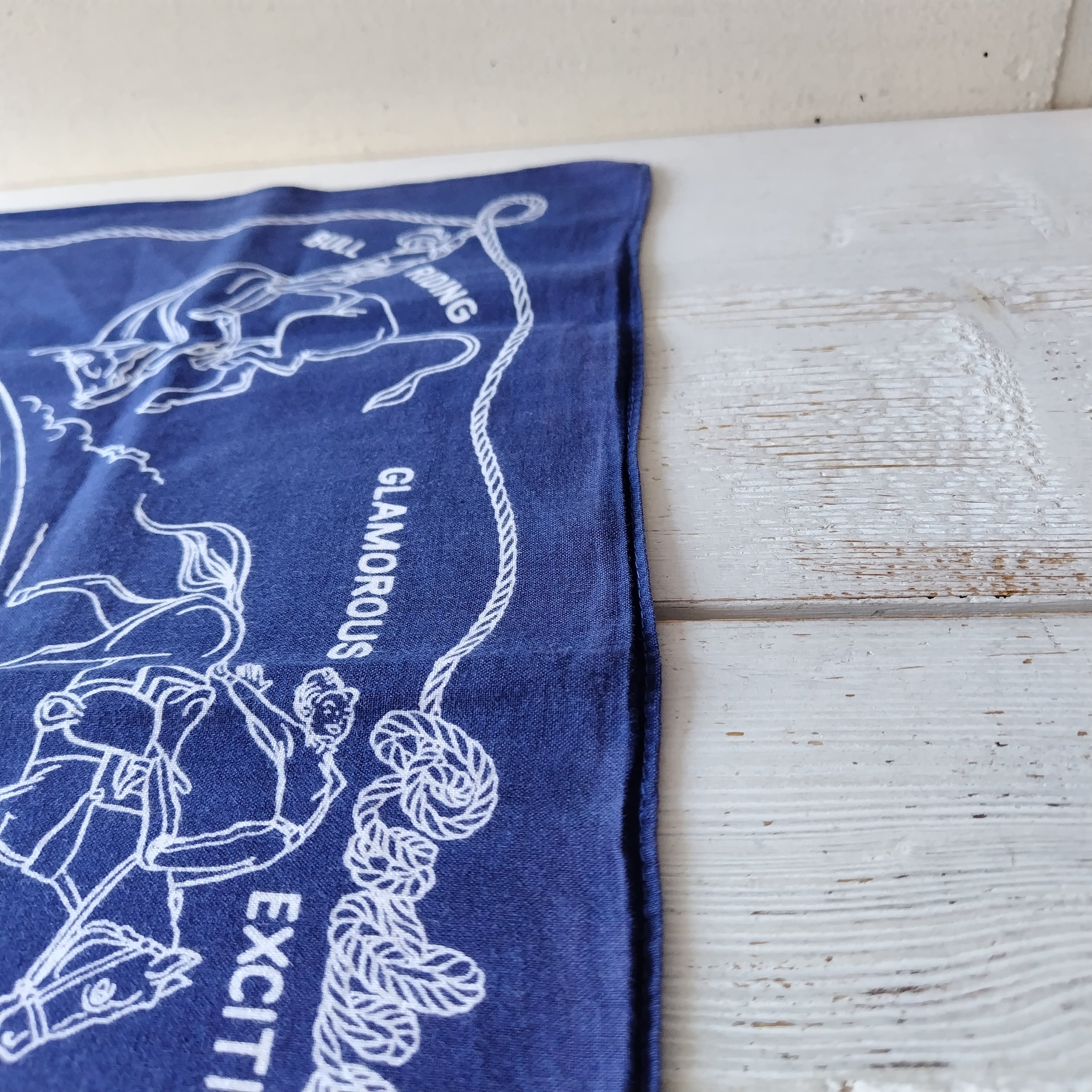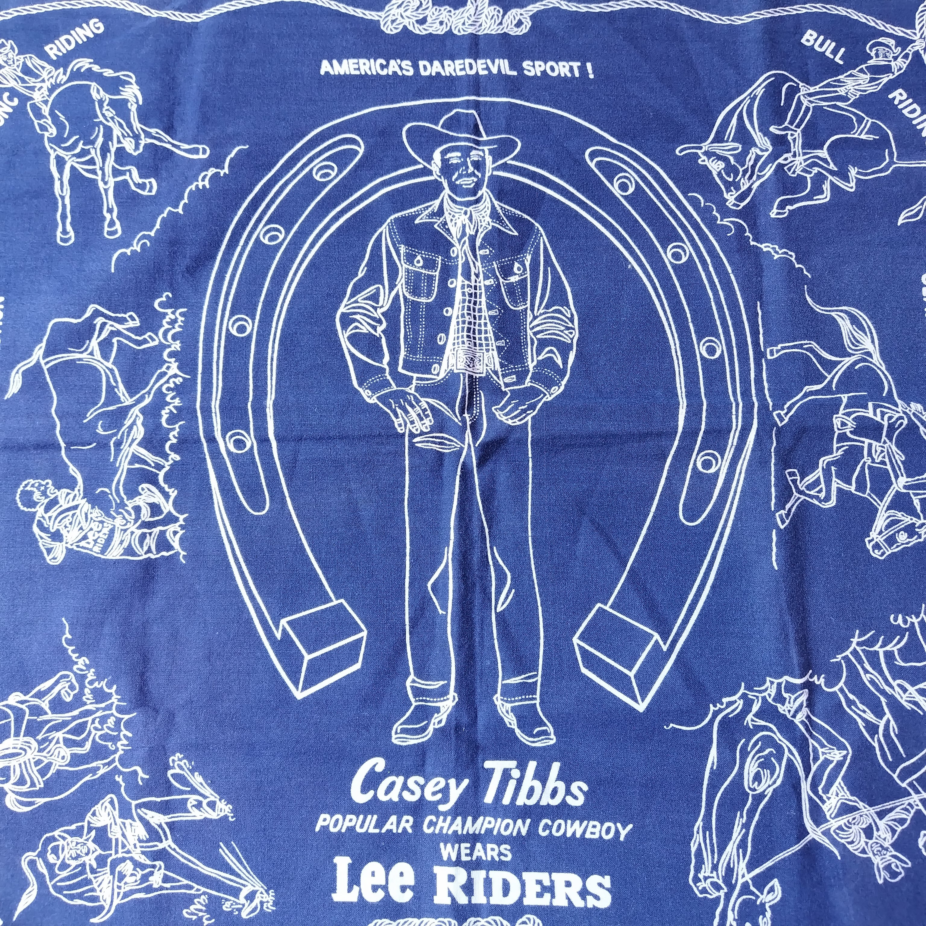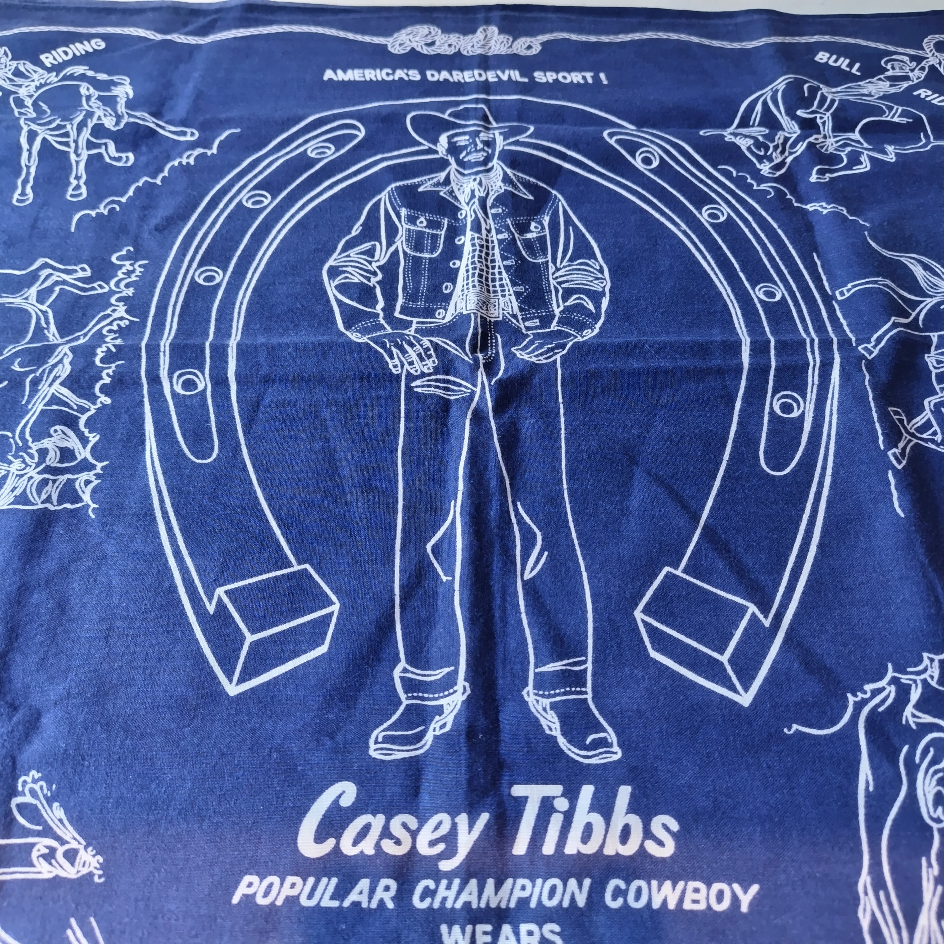 バンダナには「STEER WRESTLING」「BRONC RIDING」「BULL RIDING」「CALF ROPING」といったロデオ競技の様子や、「AMERICA'S DAREDEVIL SPORT!」などのテキストがデザインされています。