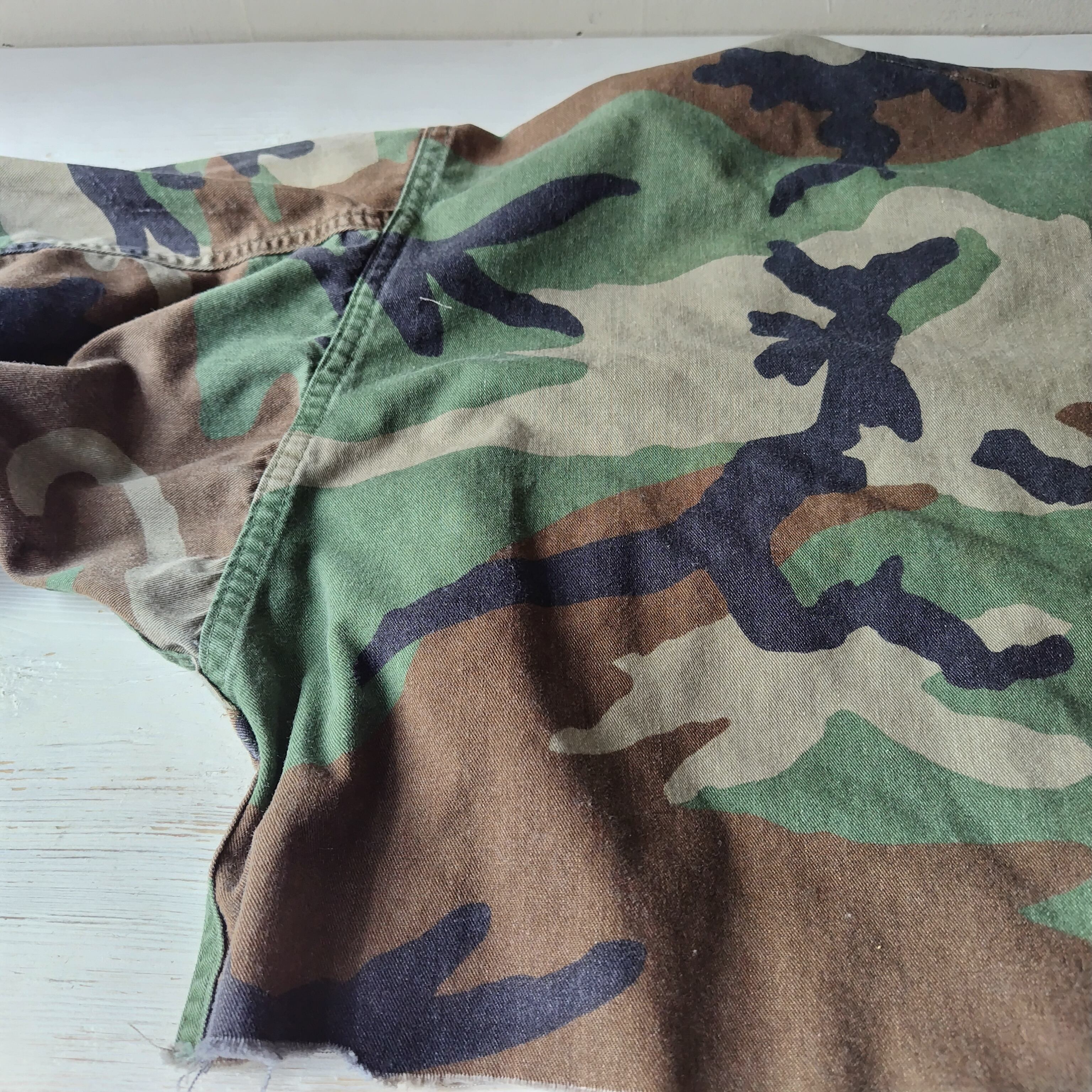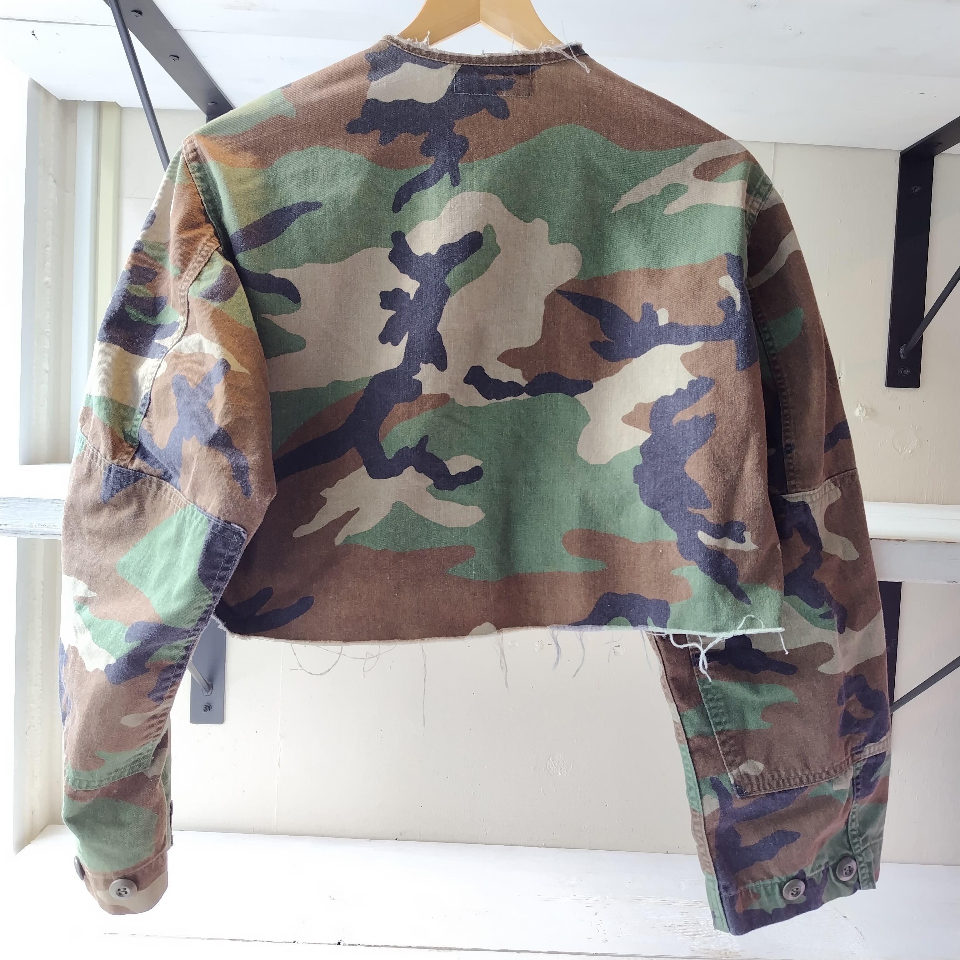 雰囲気、デザインのいいミリタリー カットオフ カモフラージュジャケットになります!