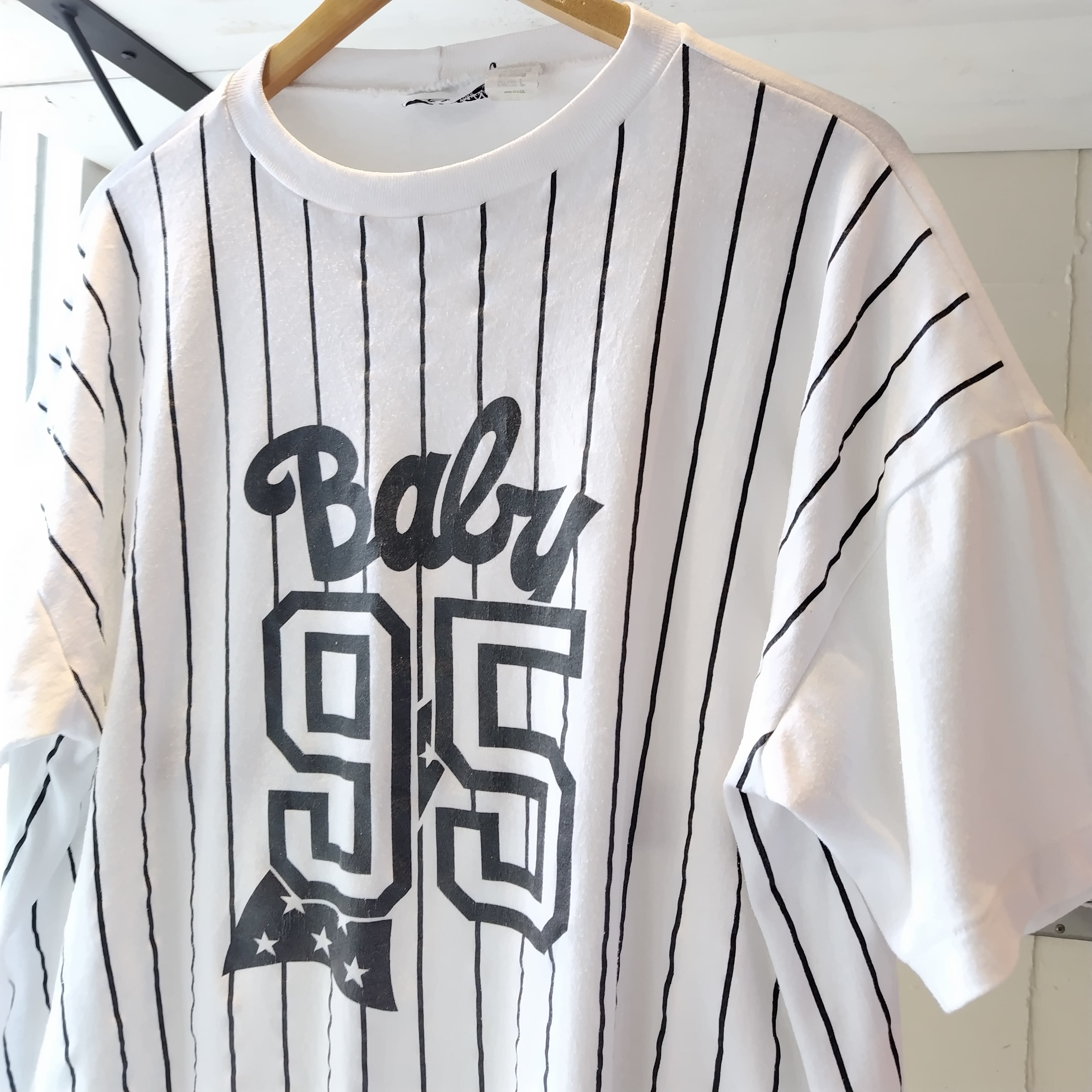 洗いこんだ感、プリントにヒビ、襟リブにピンホール、生地に微量の毛羽立ちがございますがデザイン、雰囲気が勝ってるかと思います!