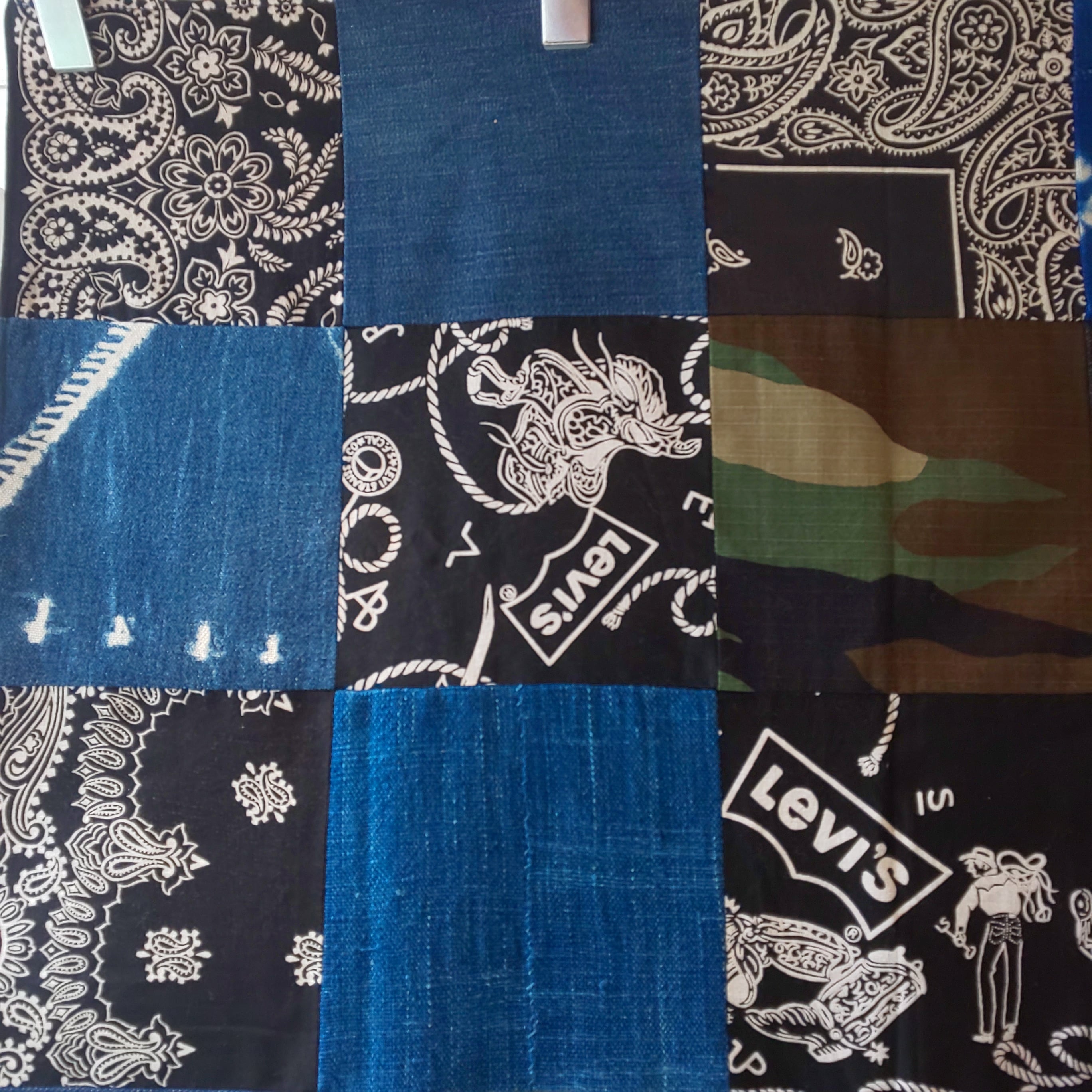 雰囲気のいいバンダナ、ミリタリー、アフリカンインディゴ、デニムをパッチワークに。