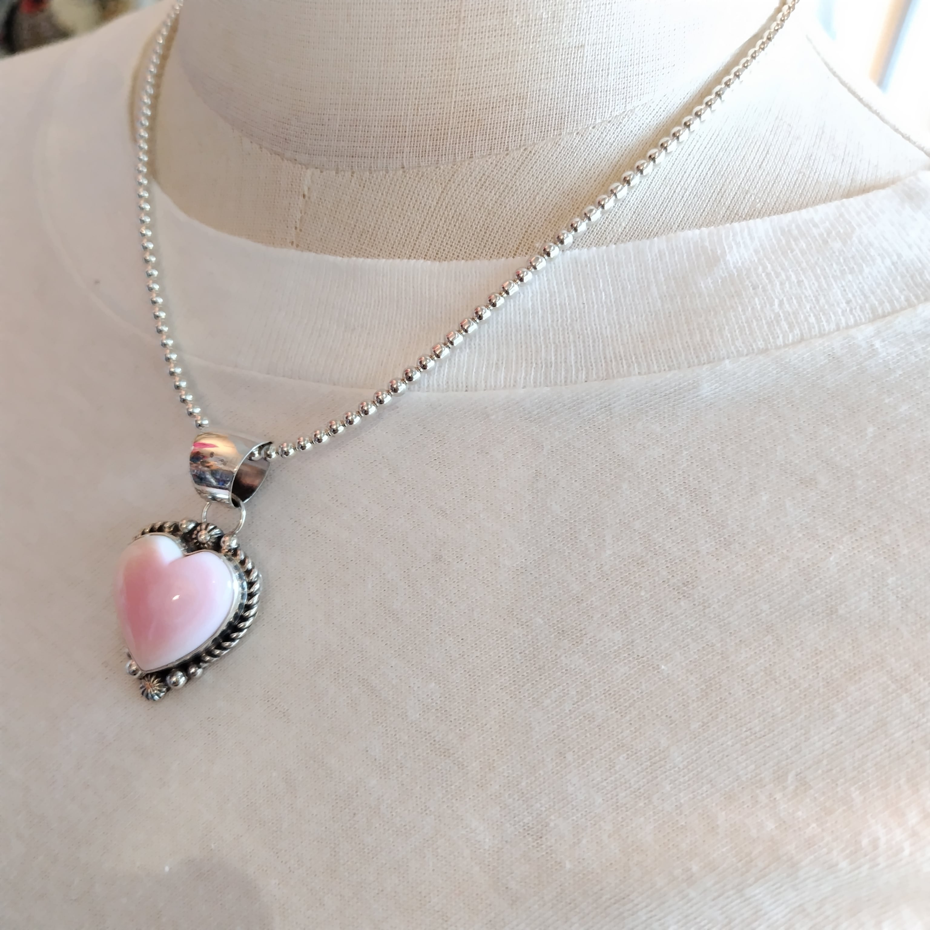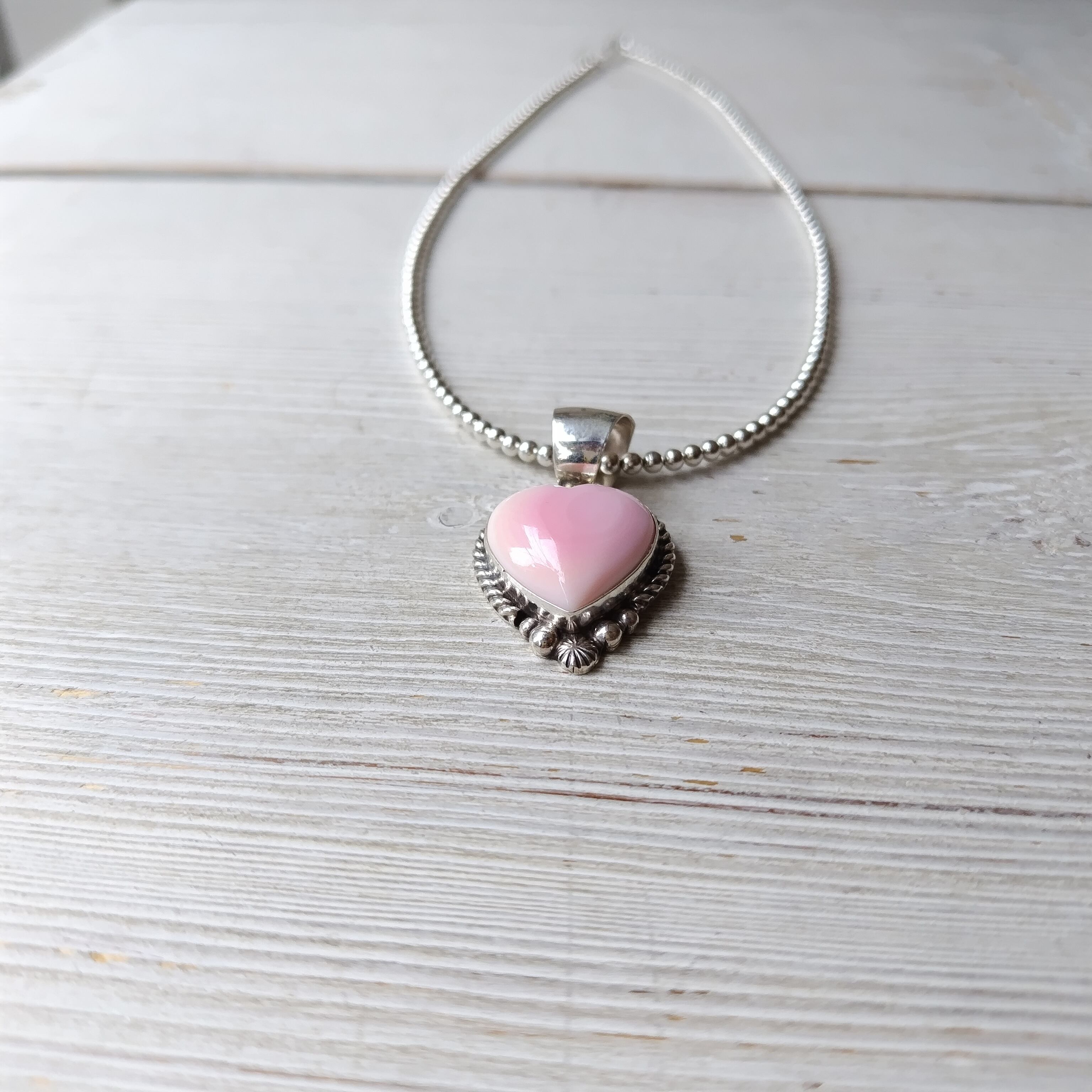 ナバホ PINK CONCH SHELL ハート シルバートップ x ナバホパール シルバーネックレス 3mm玉 45cm インディアンジュエリー
