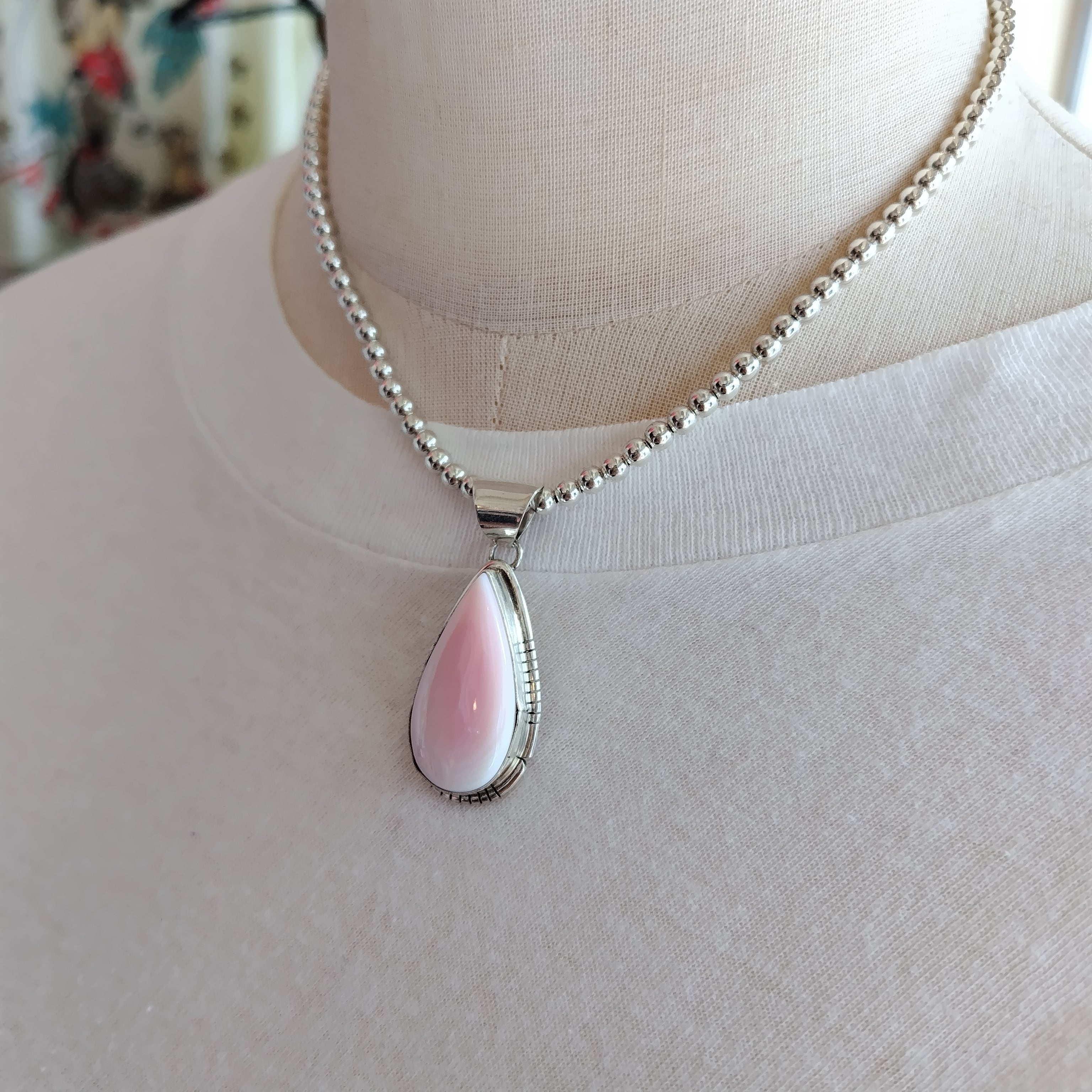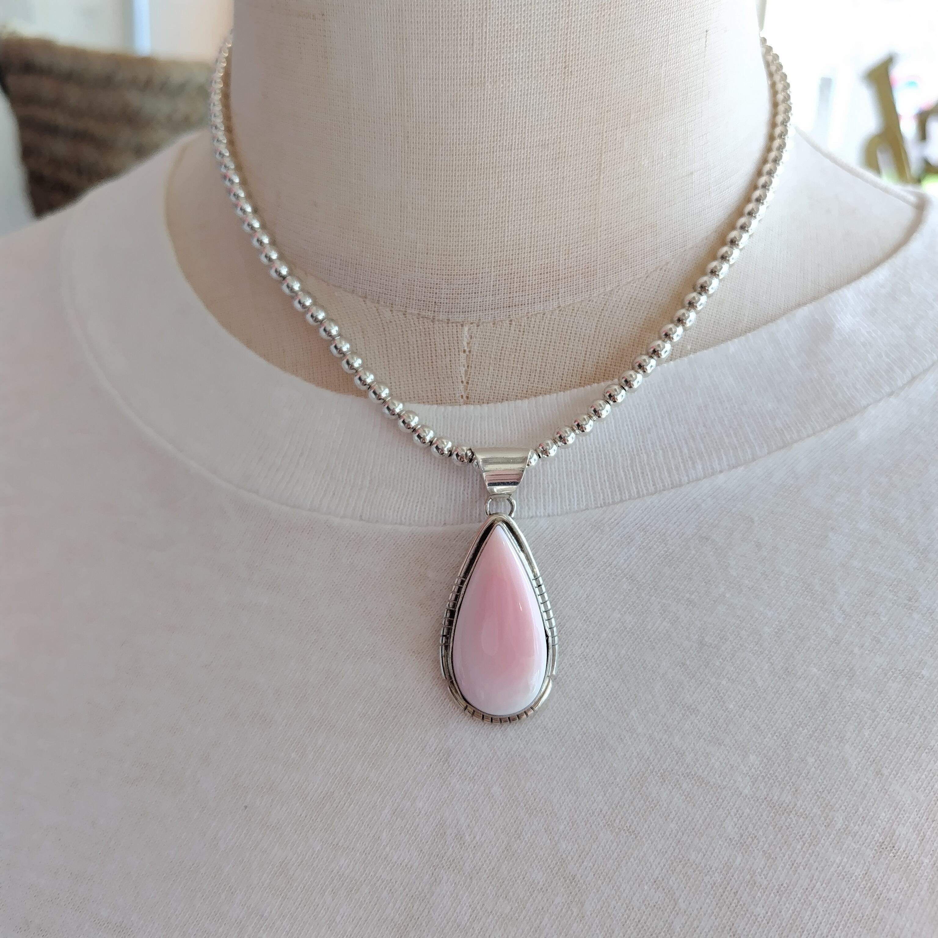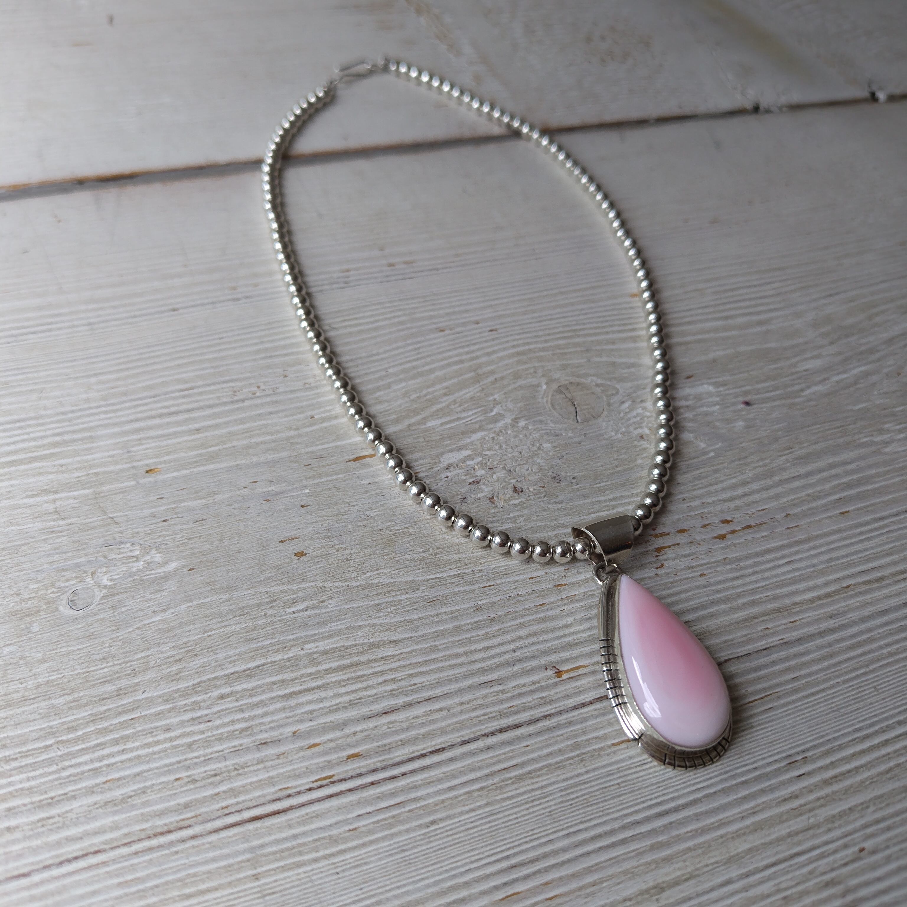 ナバホ PINK CONCH SHELL シルバートップ + ナバホパール シルバーネックレス 4mm玉 40cm