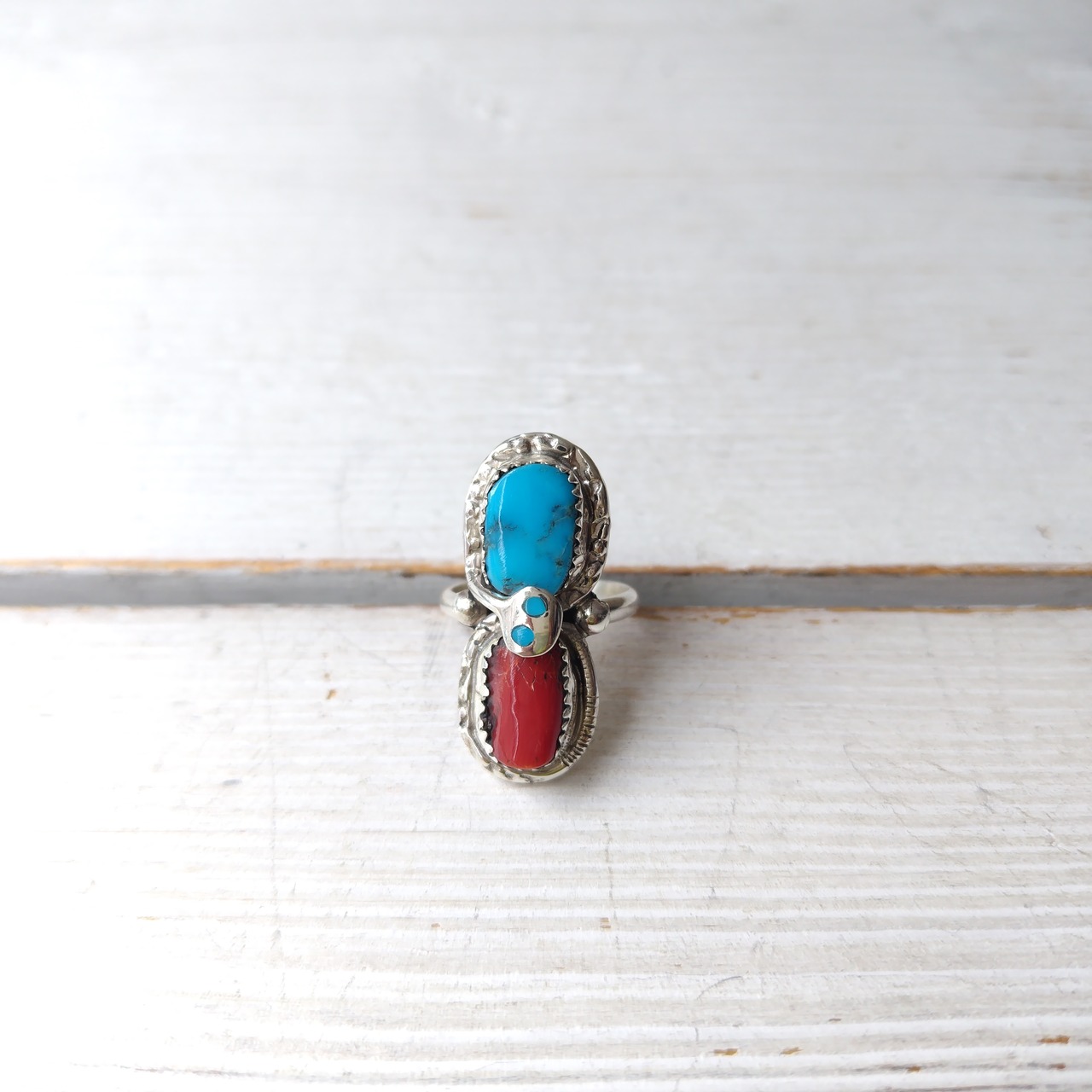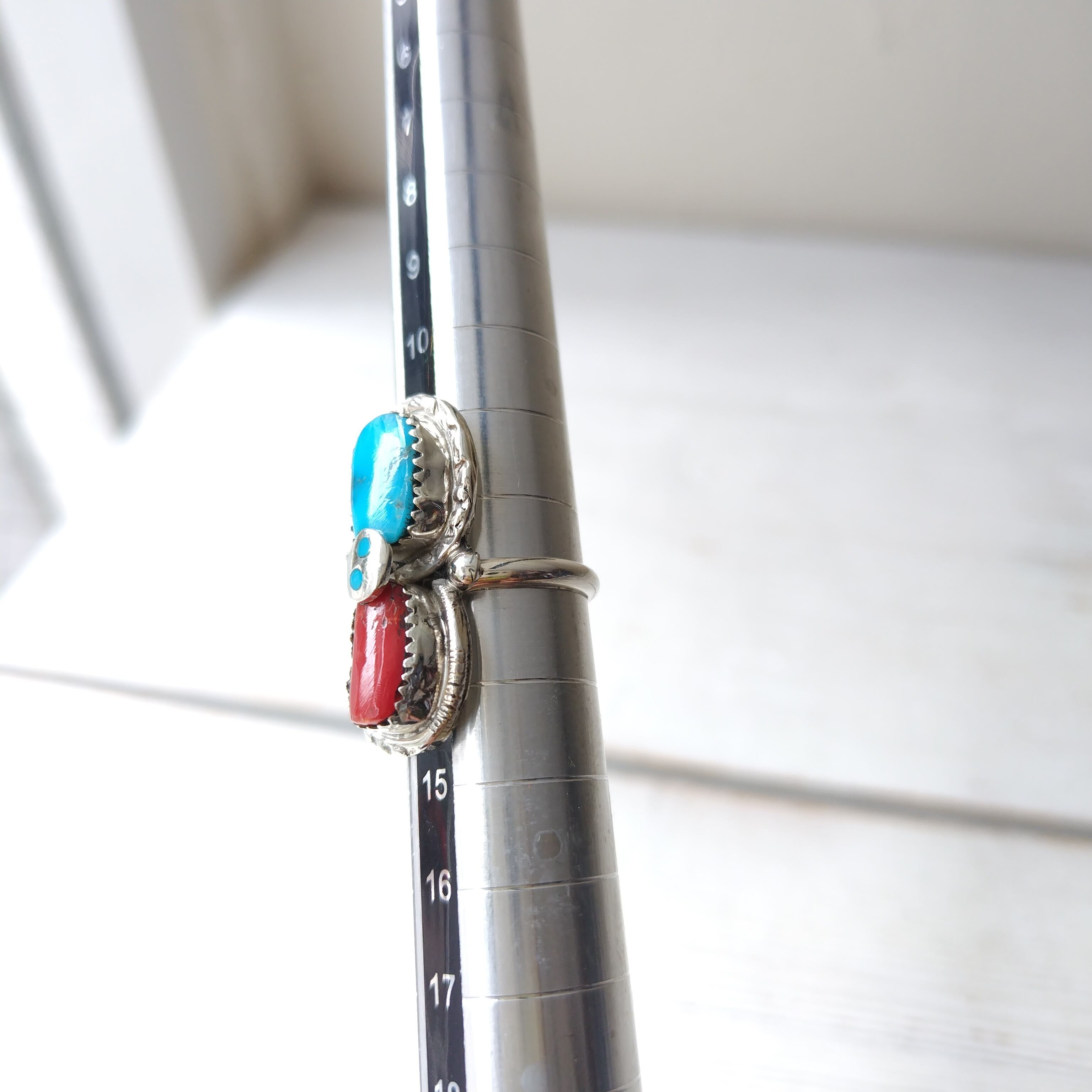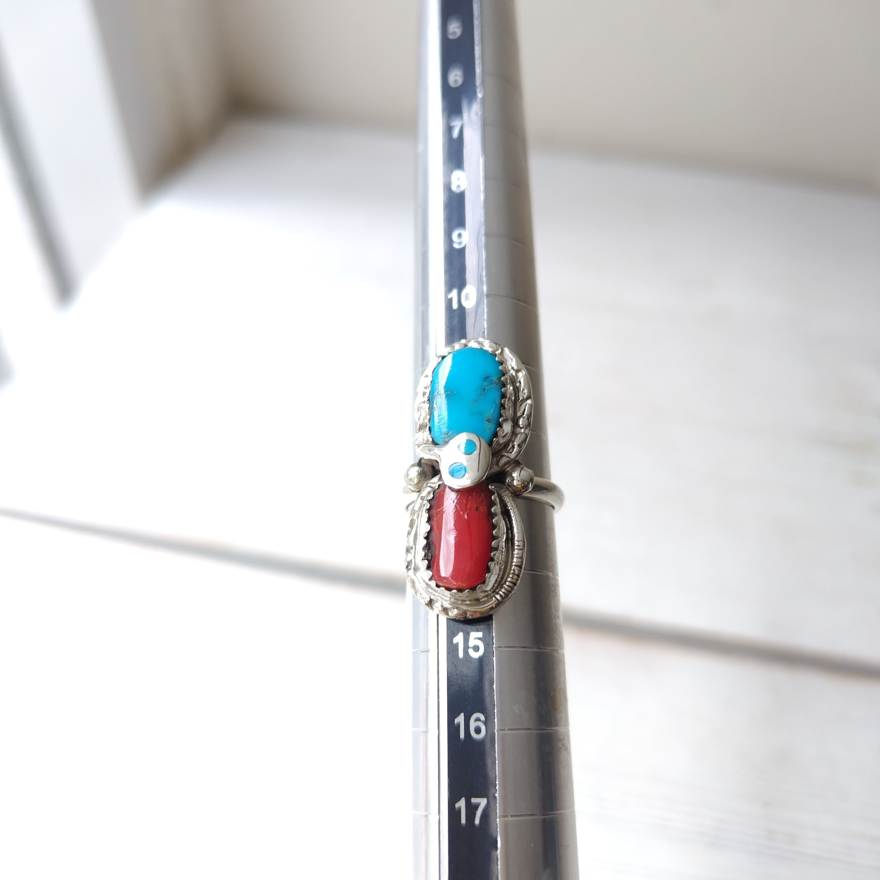 13号 ZUNI Effie Calavaza Kingman TQ x Coral Silver Ring Indianjewelry
